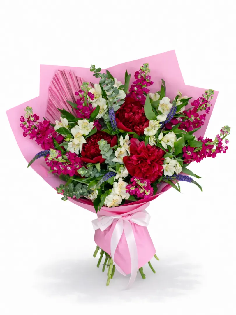яркая, насыщенная и изысканная цветочная композиция, созданная для тех, кто ценит стиль, выразительность и необычные сочетания. В букете гармонично объединены бордовые пионы или пионовидные розы, насыщенно-розовые маттиолы, белая альстромерия, синие вероники и декоративная зелень. Контраст глубоких красных оттенков с белыми и синими акцентами придаёт композиции динамику, объём и неповторимую художественную выразительность. Букет «Кассандра» идеально подойдёт для поздравления с днём рождения, юбилеем, романтическим событием, профессиональным праздником или как эффектный подарок, способный подчеркнуть индивидуальность получателя. Благодаря свежести и качеству цветов композиция долго сохраняет привлекательность, наполняя пространство ароматом и яркими красками. Стильная розовая упаковка делает букет ещё более эстетичным и современным.