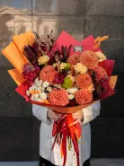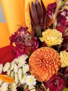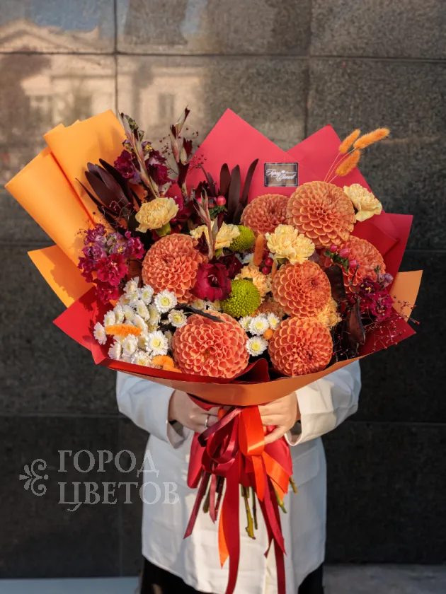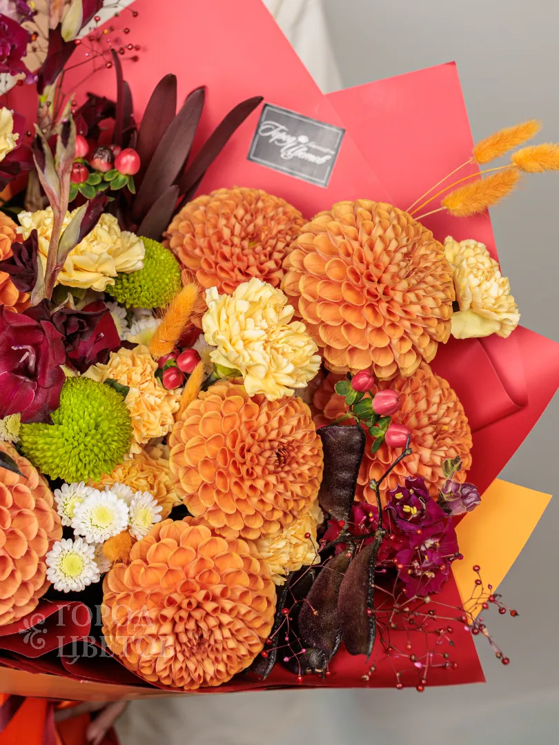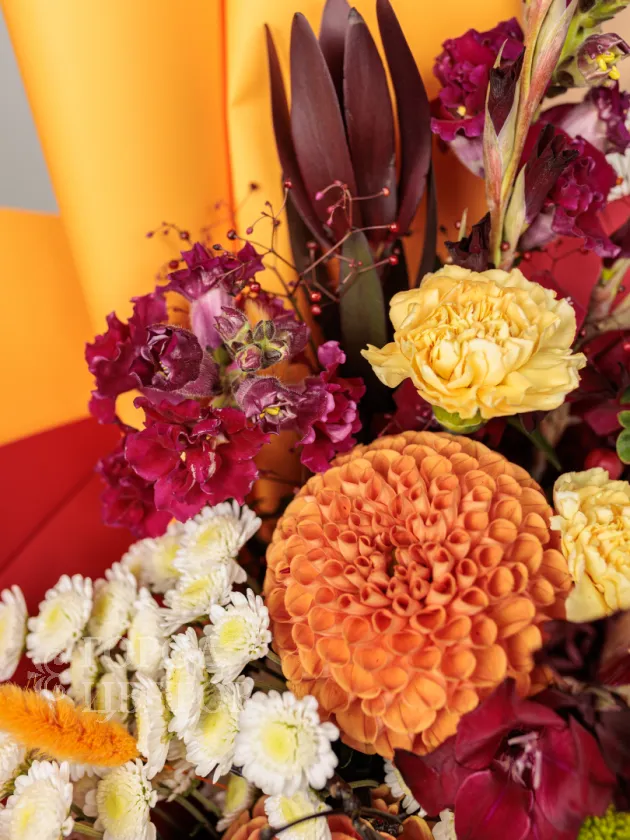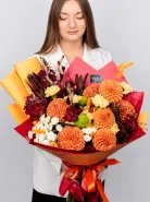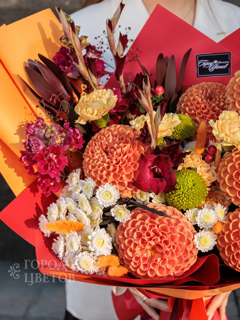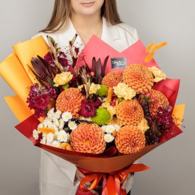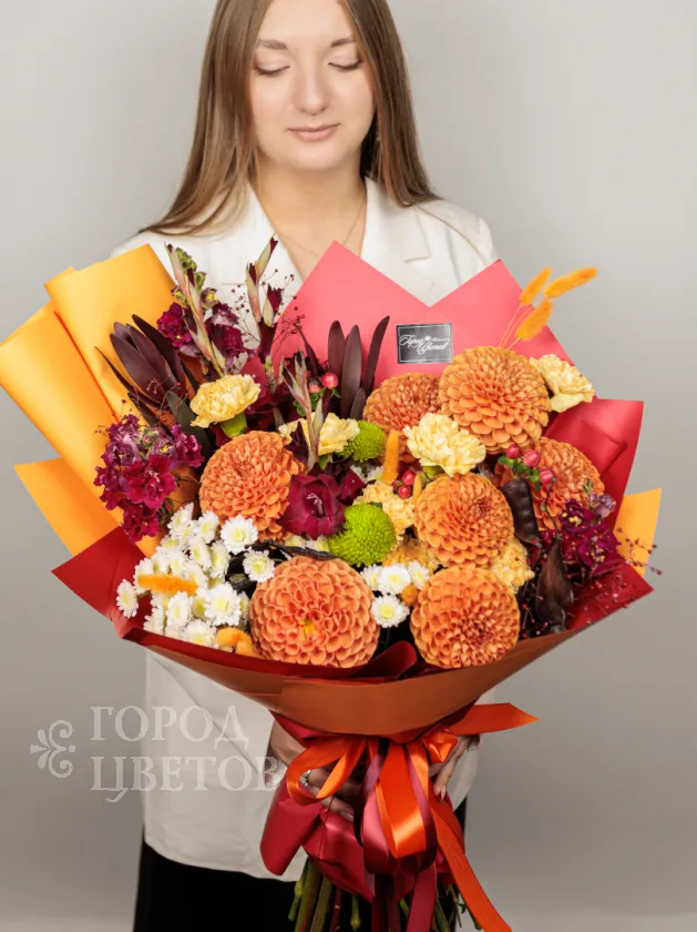 Яркий и насыщенный букет в тёплых осенних оттенках, созданный из крупных сортовых далий, объёмных хризантем, контрастных бордовых эустом, миниатюрных ромашек и декоративной зелени. Сочетание персиковых, жёлтых, бордовых и кремовых оттенков создаёт эффект настоящего осеннего праздника.