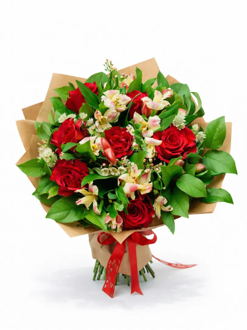 Этот букет — изысканное сочетание ярких красных роз и нежных пёстрых альстромерий, украшенных свежей зеленью. Он выглядит очень ярко и живо, передаёт тепло и любовь, а его композиция создаёт ощущение гармонии и красоты. Такой букет идеально подойдёт для особого случая или для того, чтобы порадовать близкого человека.