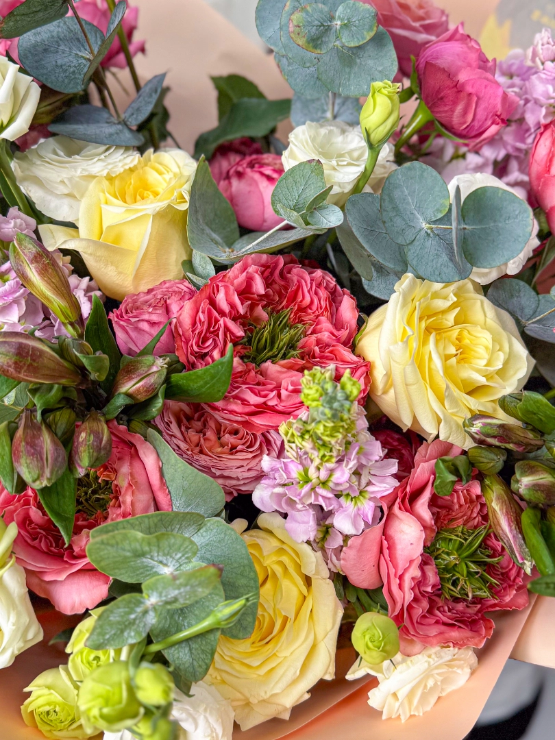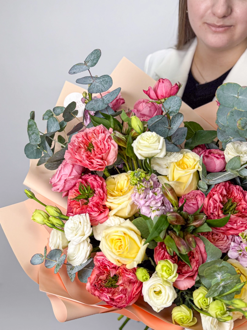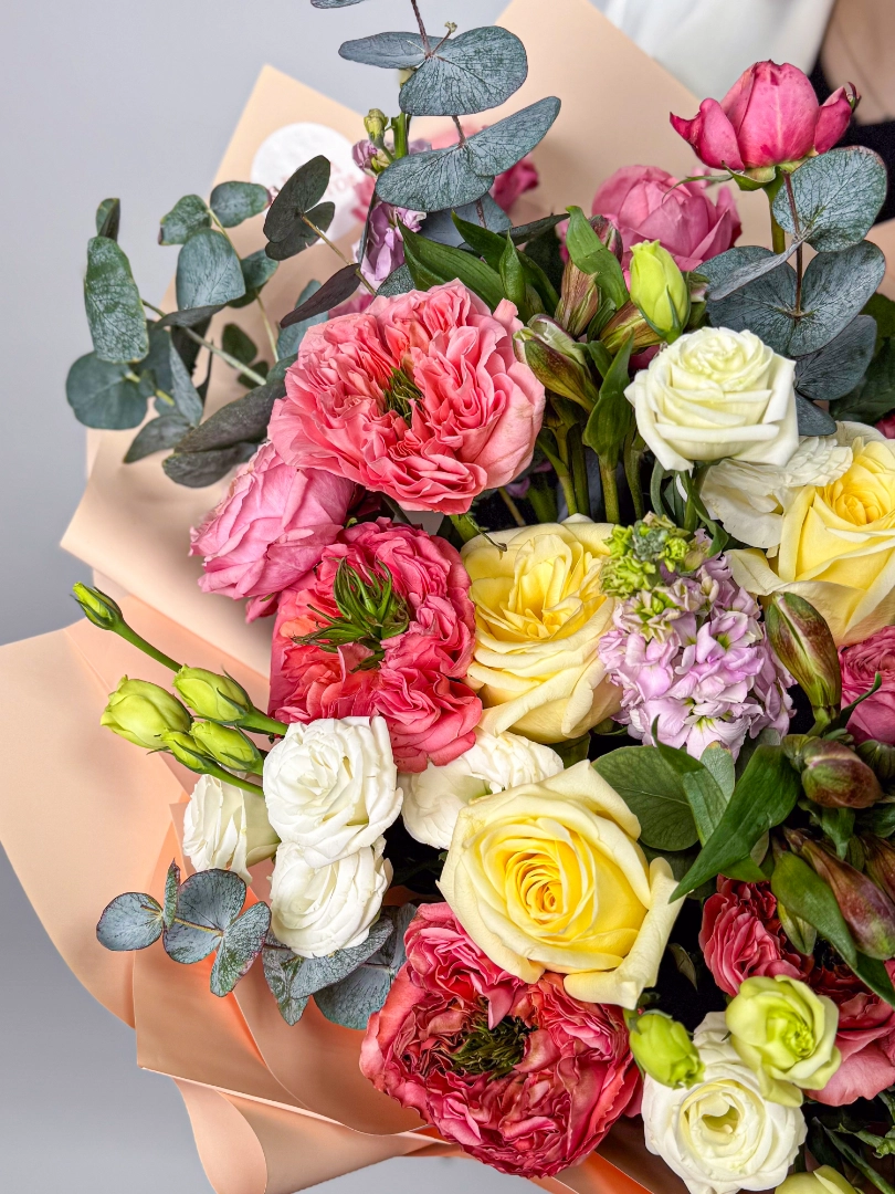 роскошная и нежная композиция, собранная из премиальных сортовых роз в пастельных оттенках. Нежно-розовые, персиковые и кремовые бутоны прекрасно сочетаются между собой, создавая мягкую, воздушную и по-настоящему романтичную цветочную палитру. Дополнительный объём и выразительность букету придают декоративная зелень и лёгкие сезонные цветы, подчёркивающие изысканность композиции. Благодаря своему элегантному оформлению и стильной упаковке в светлых тонах букет «Рузанна» становится идеальным подарком для самых важных событий: дня рождения, годовщины, свадьбы, выписки из роддома, юбилея или в знак искренней любви и признательности. Сортовые розы отличаются повышенной стойкостью и долго сохраняют свежесть, поэтому композиция будет радовать своим видом многие дни. Букет подходит для подарка девушке, маме, жене, начальнице или близкому человеку, которому хочется подарить красоту и тёплые эмоции.