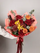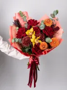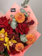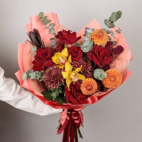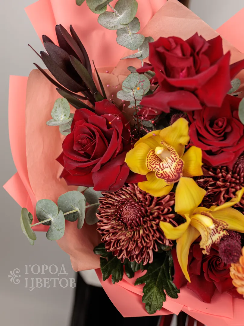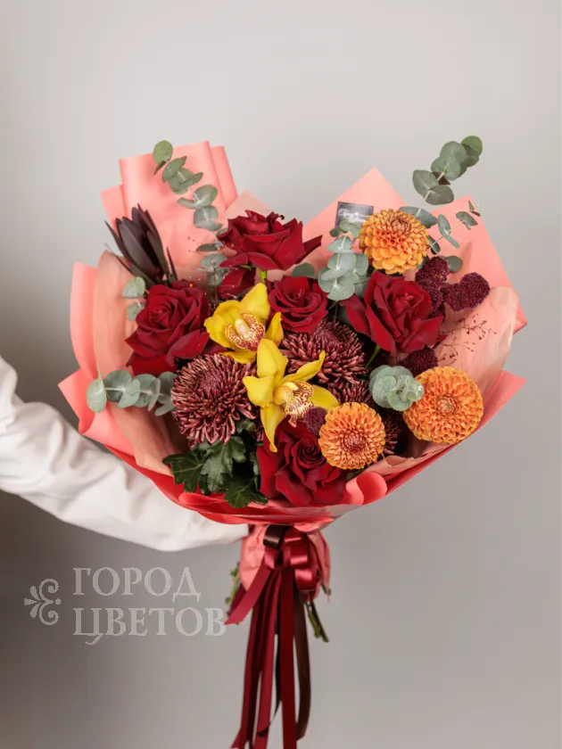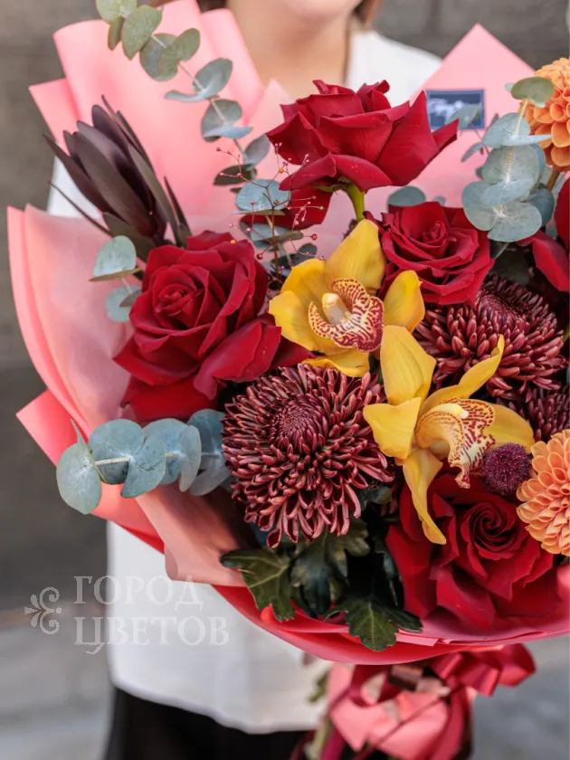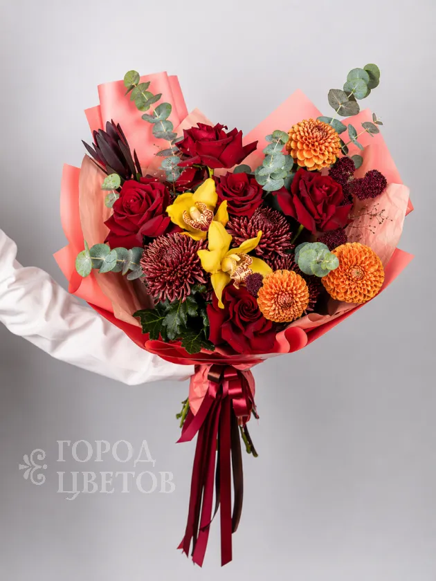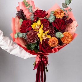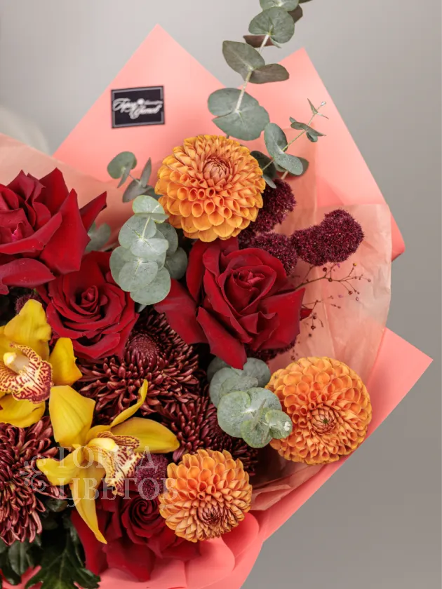 Этот роскошный букет в насыщенной красно-жёлтой гамме объединяет крупные алые розы, солнечные орхидеи, яркие оранжевые шаровидные георгины, винные хризантемы и свежий эвкалипт. Контраст тёплых оттенков делает композицию выразительной, динамичной и по-настоящему праздничной.