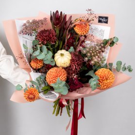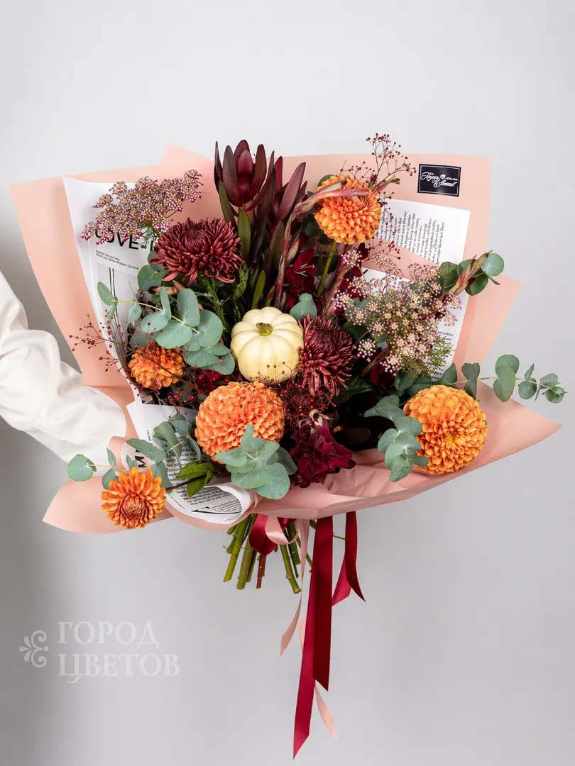 Этот оригинальный осенний букет в тёплой рыже-оливковой палитре создан для тех, кто ценит стиль, атмосферность и необычные детали. В композиции собраны яркие шаровидные георгины, глубокие бордовые хризантемы, стойкая протея, изящные веточки гиперикума, эвкалипт и декоративная зелень. Особый акцент — декоративный мини-тыквенный элемент, который делает букет по-настоящему осенним и уникальным.