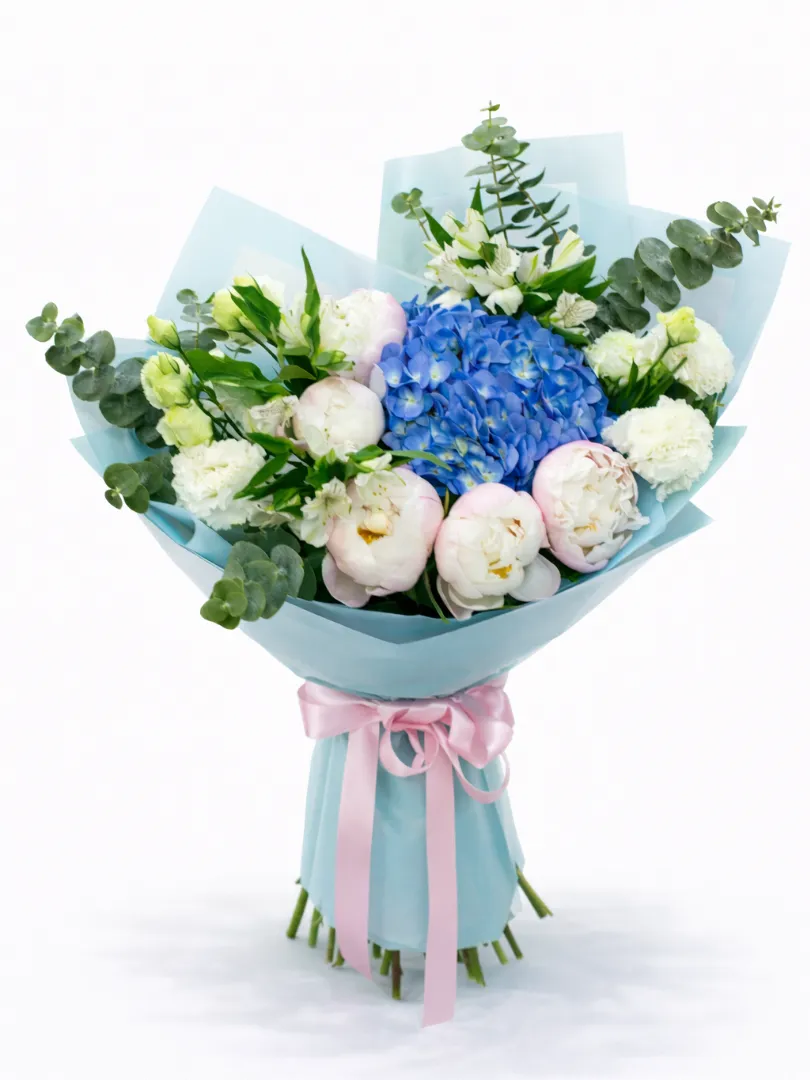 Этот изящный букет сочетает в себе нежность и свежесть. В центре расположен крупная гортензия, символизирующая гармонию и доверие. Вокруг него разбросаны нежные белые пионы, олицетворяющие чистоту и романтику. Белые альстромерии и элегантные листья эвкалипта придают композиции объем и естественную свежесть. Букет украшен нежной голубой упаковкой и аккуратной розовой лентой, подчеркивающей изысканный стиль и заботу. Идеальный подарок для выражения искренних чувств и добрых пожеланий.