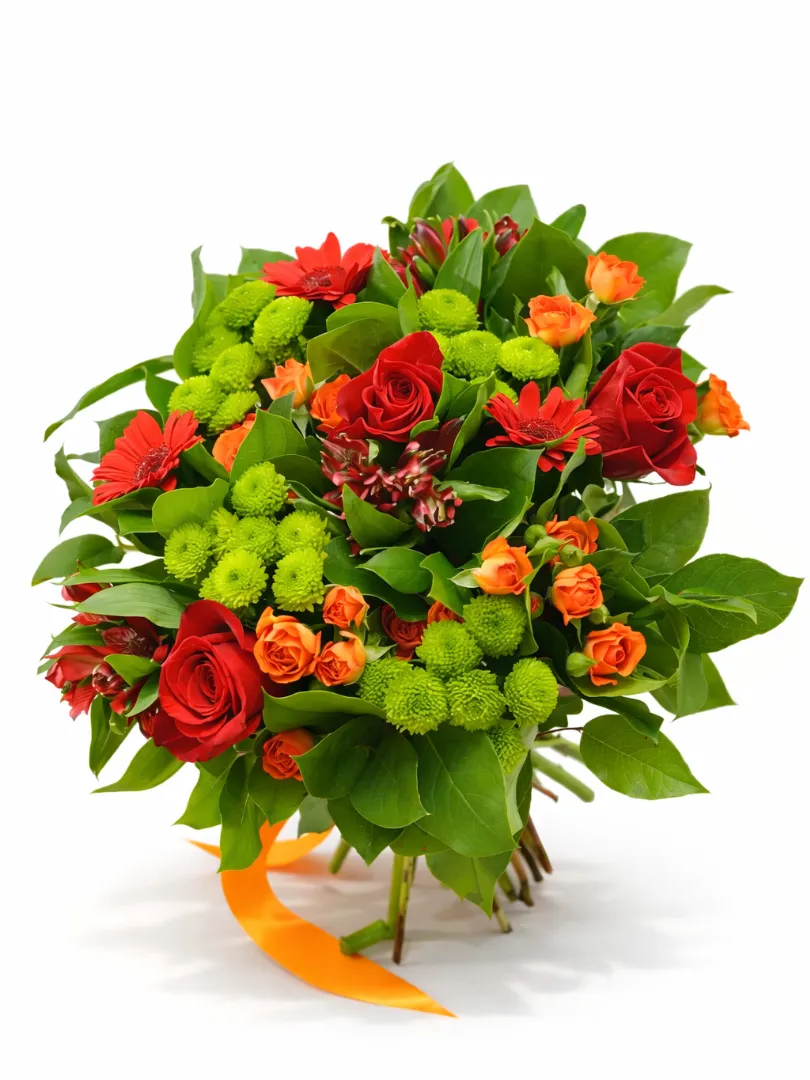 Этот яркий и насыщенный букет сочетает в себе теплые и насыщенные оттенки. В центре композиции расположены элегантные красные розы, дополняемые яркими оранжевыми мини-розами и крупными красными герберами, создающими выразительный акцент. Вокруг них разместились нежные зеленые хризантемы и алые альстромерии, добавляющие разнообразия и объем. Обильная зелень листьев подчеркивает свежесть и природную красоту всей композиции. Такой букет станет прекрасным подарком для тех, кто ценит яркие эмоции и искренние чувства, идеально подойдет для праздников и особых случаев.