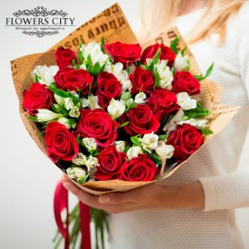 Элегантное сочетание насыщенно-красных роз и нежных белоснежных альстромерий придаёт букету утонченность и изысканность. Бархатные лепестки роз символизируют страсть и любовь, а воздушные альстромерии добавляют легкости и свежести.
