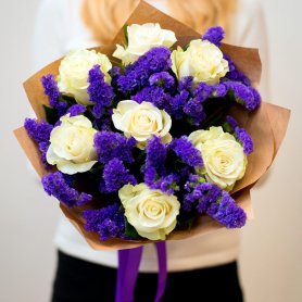 Этот изысканный букет сочетает в себе нежность и элегантность. В его составе — роскошные белые розы, символизирующие чистоту и искренние чувства, а также яркая фиолетовая статица, добавляющая выразительности и насыщенности композиции. Букет аккуратно обернут в коричневую бумагу и украшен фиолетовой лентой, что подчеркивает его утонченность и романтичность. Такой подарок станет прекрасным проявлением любви, благодарности или поздравления.