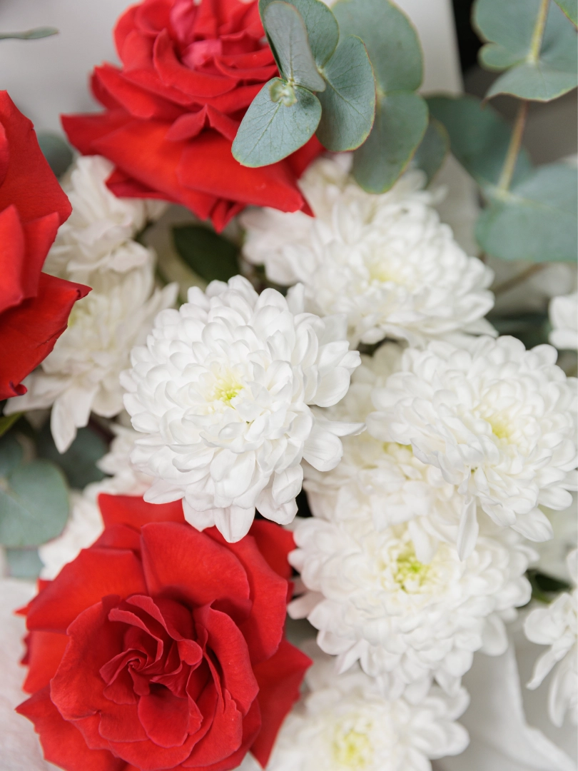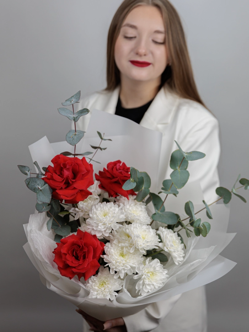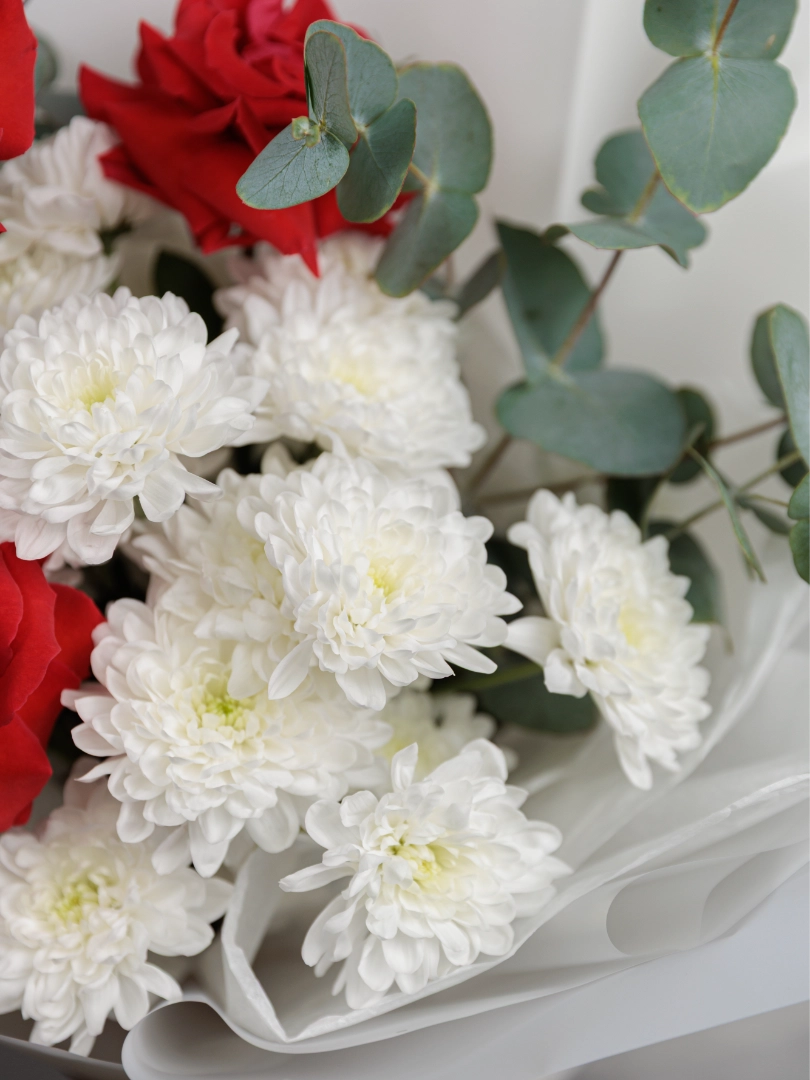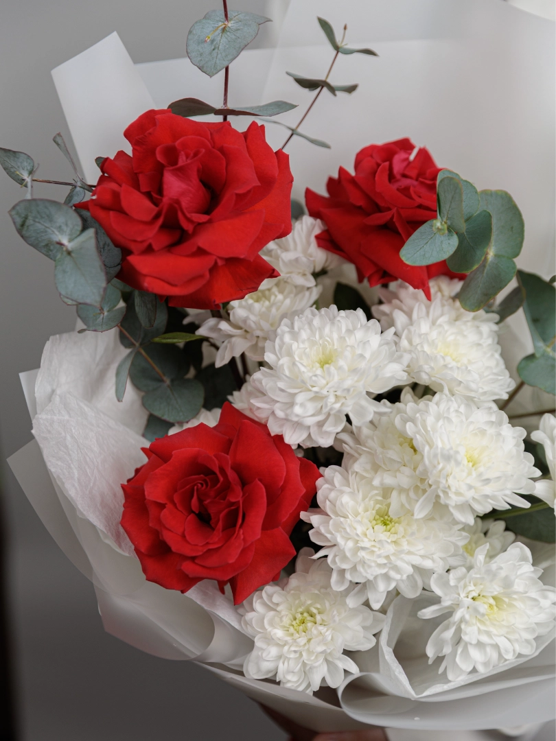 Подарите яркий и элегантный букет из свежих красных роз и белых хризантем. Идеальный подарок на любой праздник, романтическое свидание или для поздравления близких. Наши цветочные композиции отличаются высоким качеством и свежестью, а доставка цветов по городу осуществляется быстро и аккуратно.