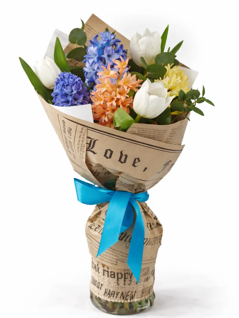 Этот изысканный букет сочетает в себе свежесть и элегантность. В его составе — белые тюльпаны, символизирующие чистоту и нежность, а также яркие голубые и нежно-персиковые гиацинты, придающие композиции насыщенность и гармонию. Букет оформлен в стильной газете с аккуратной голубой лентой, что добавляет ему оригинальности и изящества. Такой букет станет прекрасным подарком для тех, кто ценит красоту и утонченность в каждой детали.