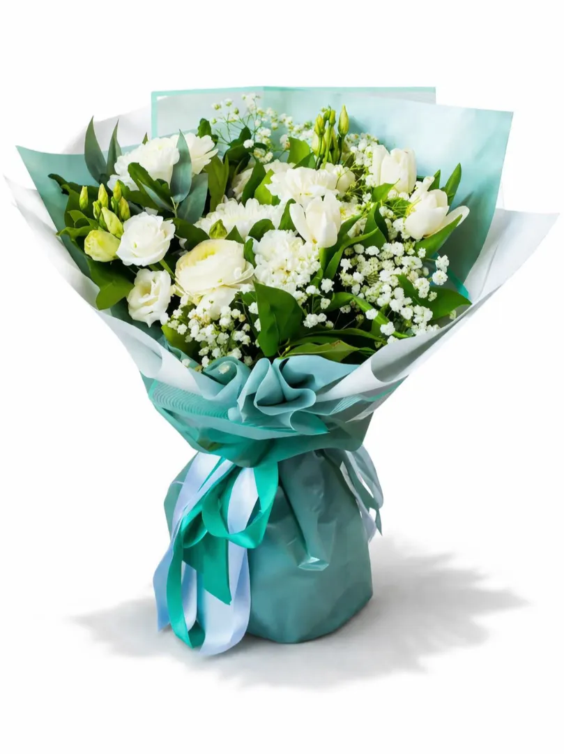 Этот изысканный букет выполнен в нежных белых тонах и наполнен свежестью и утонченностью. В его составе элегантные белые ранункулюсы, нежные тюльпаны и тонкие веточки гипсофилы, создающие легкую и воздушную атмосферу. Зеленая зелень добавляет композиции живости и природной красоты. Букет оформлен в пастельных оттенках голубой и белой обертки с аккуратной лентой, придающей ему завершенность и изысканность. Такой букет отлично подойдет для романтического поздравления, выражения искренних чувств или для особого повода.