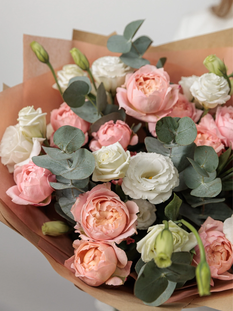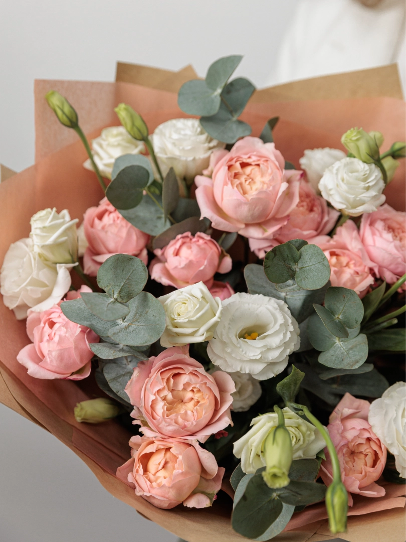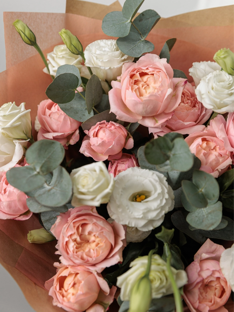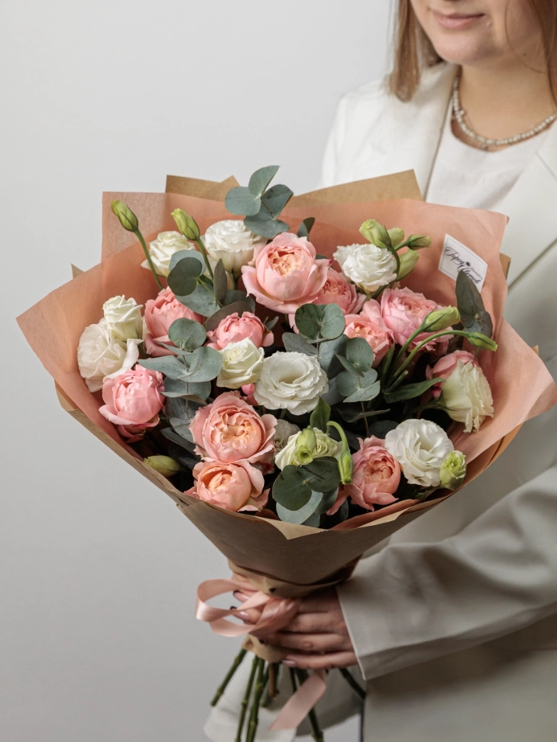 Красивый букет из свежих пионовидных рз и эустом, идеально подходящий для романтического подарка, поздравления с праздником или украшения интерьера. Этот цветочный букет отличается высоким качеством, длительным сроком хранения и оригинальным дизайном. Наши флористы создают уникальные цветочные композиции для любого события — день рождения, свадьбу, юбилей или просто чтобы поднять настроение.