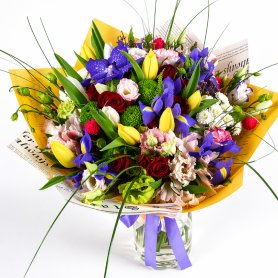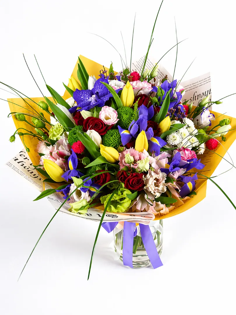 Этот яркий и насыщенный букет создает ощущение свежести и радости. В его составе гармонично сочетаются насыщенные бордовые розы, нежная бело-розовая эустома и изящные фиолетовые ирисы. Добавление зелени и мелких ярких элементов придает композиции объем и динамичность. Букет оформлен в мягкой желтой обертке с аккуратной лентой, что делает его идеальным подарком для особого случая, выражения теплых чувств или просто чтобы порадовать близкого человека.