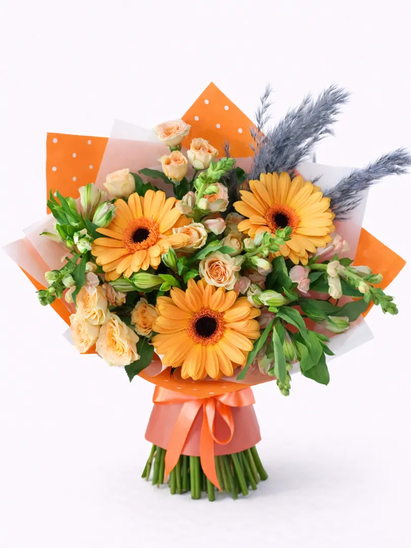 Этот яркий и солнечный букет сочетает в себе тепло и свежесть. В его составе доминируют крупные оранжевые герберы, которые придают композиции яркость и радость. Дополняют их нежные бежевые розы и свежая зеленая листва, создавая гармоничный и живой образ. В оформление добавлены мягкие серые пушистые травы, придающие букету немного изящества и текстурности. Обертка ярко-оранжевая с белыми точками подчеркивает солнечное настроение, делая этот букет идеальным подарком для поднятия настроения и выражения теплых чувств.