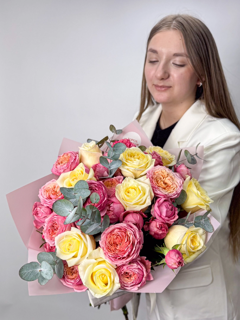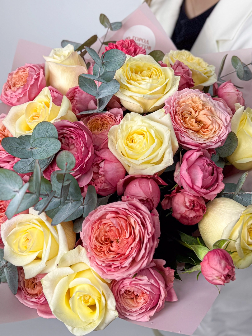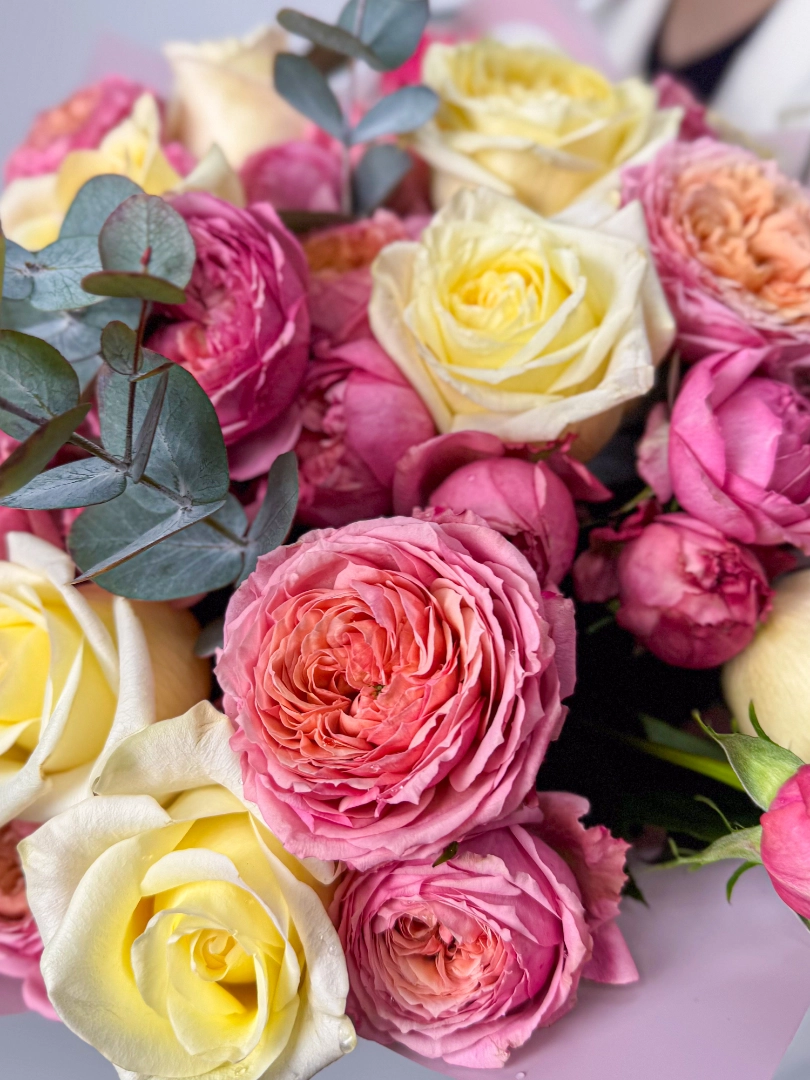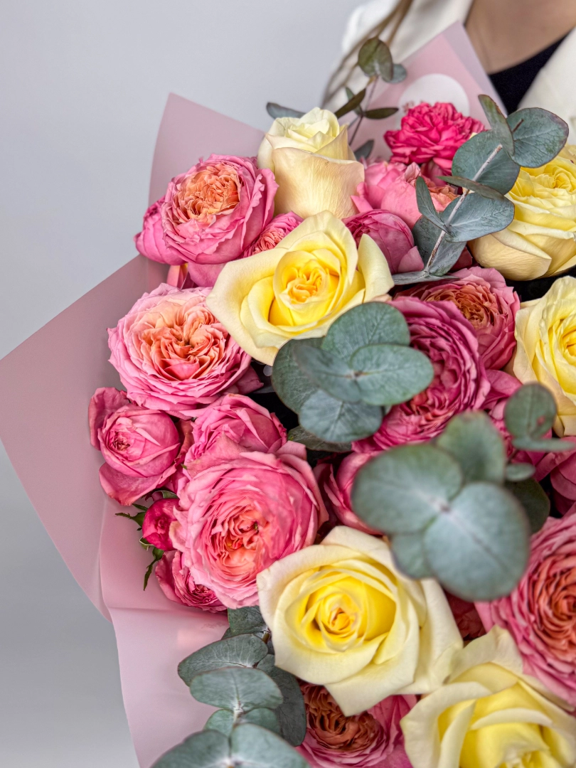 Этот утончённый букет в пастельных оттенках сочетает крупные кремово-лимонные розы, нежные розовые кустовые розочки и свежий эвкалипт. Мягкая палитра бело-розовых тонов создаёт ощущение лёгкости, чистоты и романтичного настроения. Благодаря крупным распустившимся бутонам и аккуратным мини-розам композиция выглядит объёмной, воздушной и по-настоящему элегантной.