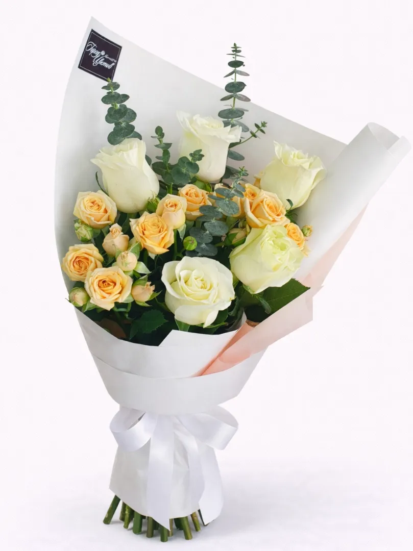 элегантная и светлая композиция, созданная в изысканной кремово-белой гамме. В букете гармонично сочетаются нежные белые розы и кремовые кустовые розы с мягким персиковым оттенком, дополненные веточками эвкалипта, который придаёт композиции свежесть и современный стиль. Лёгкая воздушная упаковка в бело-розовых тонах подчёркивает утончённость букета и делает его универсальным подарком для любого случая. Букет «Бьянка» идеально подходит для поздравления с днём рождения, свадьбой, годовщиной, днём ангела, выпускным или как комплимент близкому человеку. Благодаря качественным свежим цветам композиция долго сохраняет свою привлекательность и станет украшением любого интерьера. Этот букет прекрасно подойдёт для подарка девушке, маме, коллеге, невесте или учителю, выражая искренние чувства, внимание и заботу.