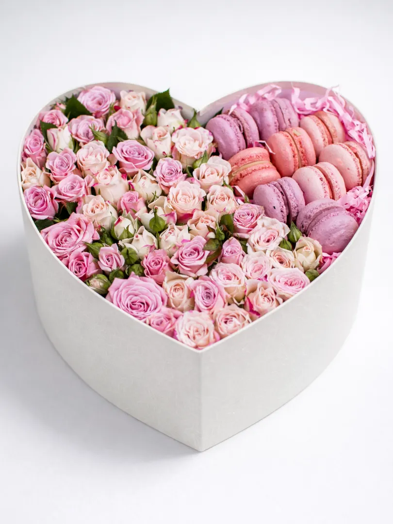 Подарочный букет в форме сердца, наполненный нежными розами и вкусными макаронами — идеальный романтический подарок для выражения любви и нежности. В этом роскошном цветочном наборе собраны свежие розовые и белые розы, создающие атмосферу уюта и романтики, а аппетитные макароны в розовых оттенках добавляют оригинальности и сладости в композицию. Такой букет-сердце станет незабываемым сюрпризом на День Валентина, годовщину или любой особый случай. Создайте особое настроение и подчеркните свои чувства с помощью этого стильного и вкусного подарка!