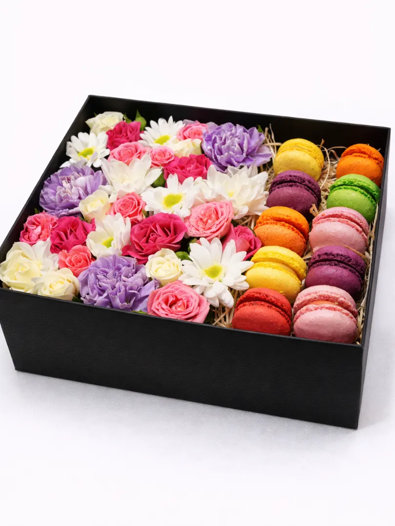 Это изысканный подарок, сочетающий в себе нежность и яркость. В красивой подарочной коробке с голубой лентой аккуратно уложены свежие цветы разных оттенков — белые, розовые, фиолетовые, а также ароматные мини-розы и эустомы. В дополнение к цветочной композиции — аппетитные французские макаруны ярких цветов: желтые, оранжевые, розовые, фиолетовые и зеленые, — которые создают праздничное и радостное настроение. Такой букет станет прекрасным подарком на любой случай, выражающим тепло, заботу и искренние эмоции.