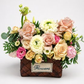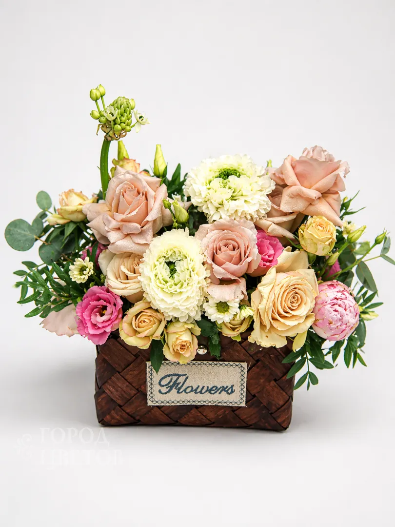 Это элегантная и нежная композиция из свежих цветов, созданная для украшения интерьера или в качестве подарка. В ней гармонично сочетаются розовые и белые розы, пион и другие декоративные цветы, дополненные зеленой листвой, что придает ей объем и свежесть. Композиция помещена в стильную плетеную корзин, что подчеркивает её изысканность и заботу о деталях. Идеальный выбор для особых случаев, чтобы выразить чувства и создать праздничное настроение.