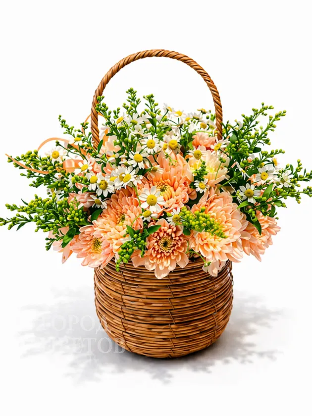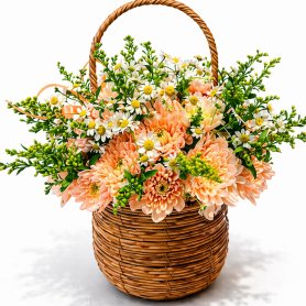 Изящная и нежная композиция из свежих полевых цветов в мягких пастельных тонах. В центре внимания — очаровательные белые ромашки с яркими зеленоватыми сердцевинами, дополненные зелеными акцентами. Цветы аккуратно собраны в красивую плетеную корзинку с аромасаше, что придает композиции праздничный и романтичный вид. Идеальное решение для поздравления, особого случая или в качестве искреннего знака внимания и любви.