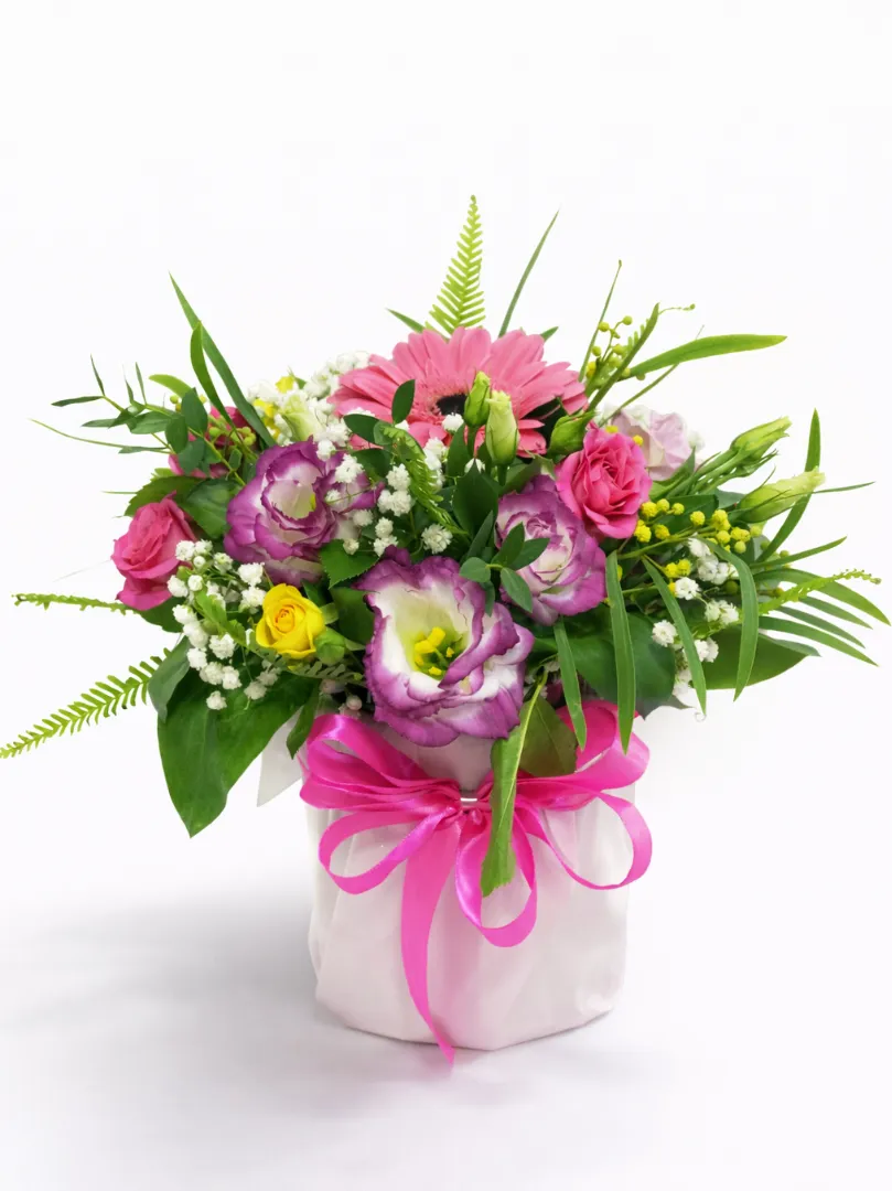 Это изысканная цветочная композиция, созданная для украшения любого торжества или в качестве приятного подарка. В центре внимания — яркие и нежные оттенки розовых и желтых цветов, дополненные свежей зеленью, которая придает букету объем и свежесть. Композиция оформлена в элегантную упаковку с яркой розовой лентой, что делает ее особенно привлекательной и праздничной. Идеально подойдет для выражения любви, благодарности или просто для поднятия настроения.