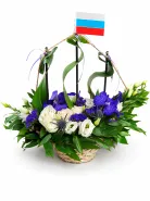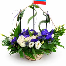 это уникальный подарок, символизирующий национальную гордость. Этот изысканный букет состоит из белоснежных роз и ярких синих и фиолетовых цветов, красиво оформленных на фоне насыщенно-зеленых листьев. Такой букет идеально подойдет для праздников, государственных мероприятий или в качестве выразительного подарка для близких и коллег.