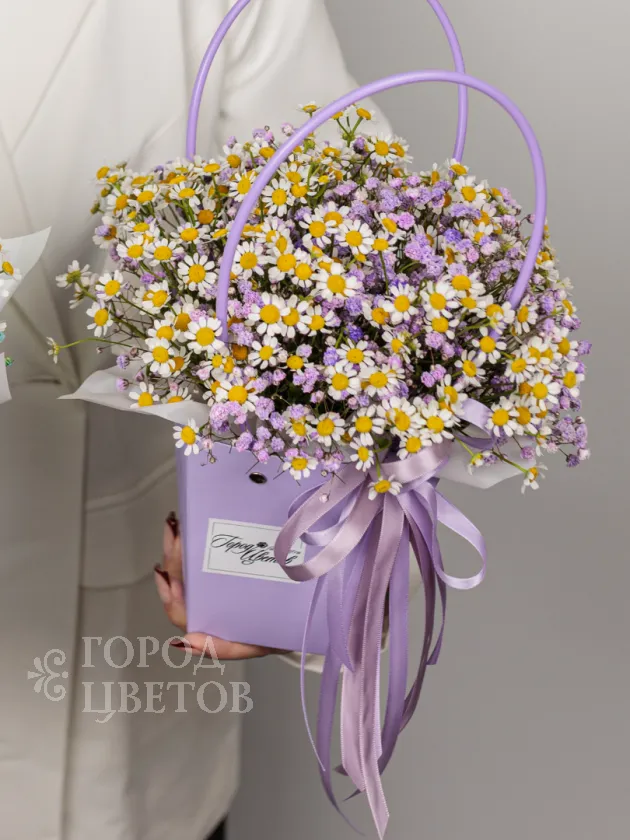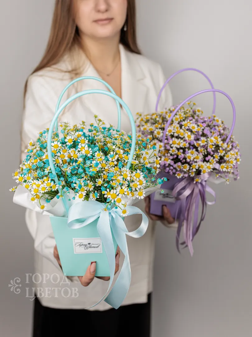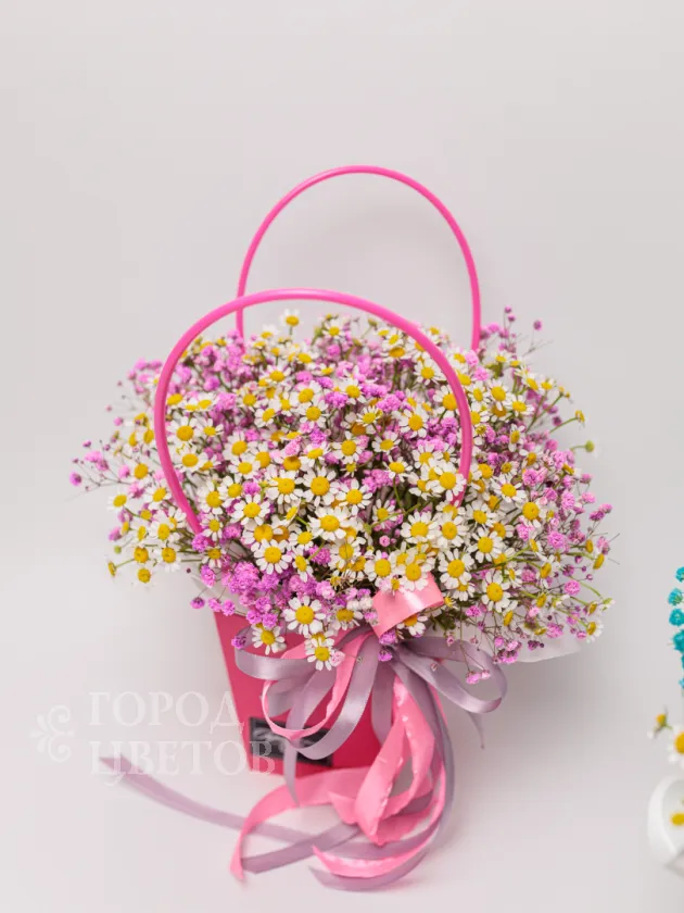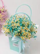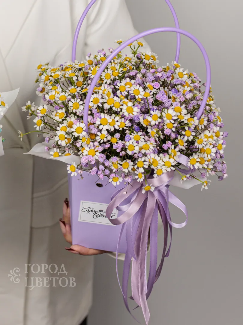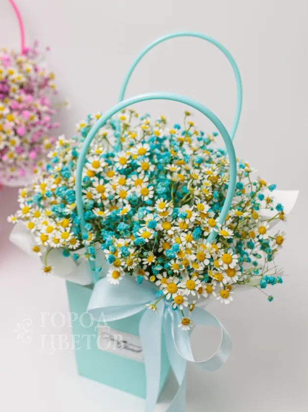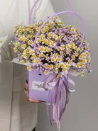 Эта нежная композиция из мини-ромашек и окрашенной гипсофилы в коробочке — идеальный вариант для праздничного и лёгкого подарка. Белые ромашки с солнечными жёлтыми сердцевинками гармонично сочетаются с гипсофилой, создавая яркое и радостное настроение. Композиция оформлена в стильную коробку и украшена атласной лентой, что делает её аккуратной, эстетичной и современной.