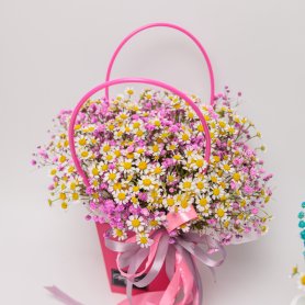 Такая цветочная композиция идеально подойдёт для дня рождения, 1 сентября, Дня учителя, выписки из роддома, поздравления коллеги, сюрприза подруге или как милый знак внимания. Ромашки и гипсофила отличаются стойкостью, поэтому букет будет долго радовать своим свежим видом.