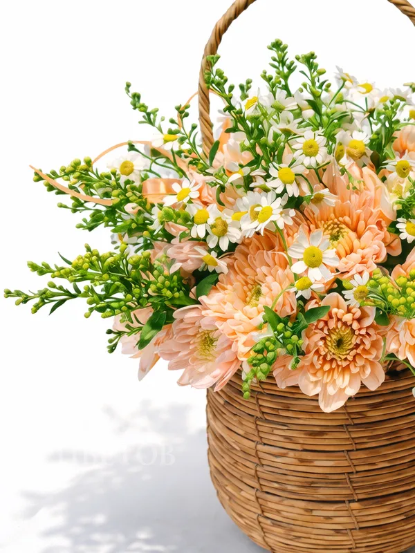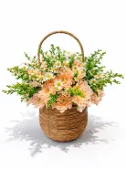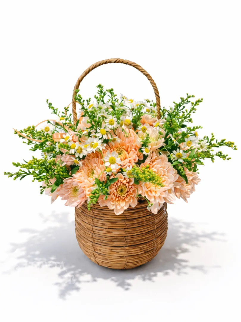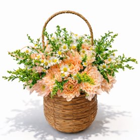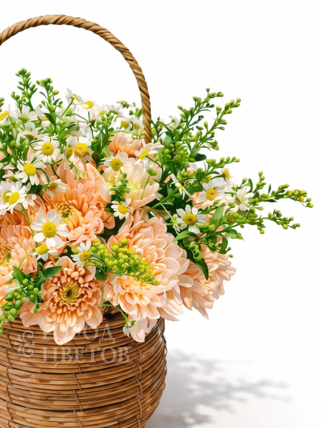 Изящная и нежная композиция из свежих полевых цветов в мягких пастельных тонах. В центре внимания — очаровательные белые ромашки с яркими зеленоватыми сердцевинами, дополненные зелеными акцентами. Цветы аккуратно собраны в красивую плетеную корзинку с аромасаше, что придает композиции праздничный и романтичный вид. Идеальное решение для поздравления, особого случая или в качестве искреннего знака внимания и любви.
