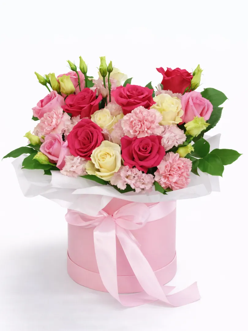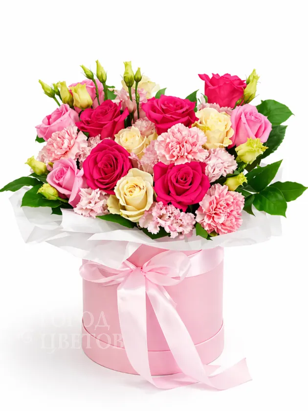 Элегантная композиция из свежих роз и гвоздик нежных розовых, кремовых и насыщенных красных оттенков. Изысканный букет, аккуратно собранный в стильную розовую корзину с атласной лентой, станет прекрасным подарком, который выразит вашу любовь, благодарность или просто поднимет настроение. Идеальное решение для особых случаев и праздничных мероприятий.