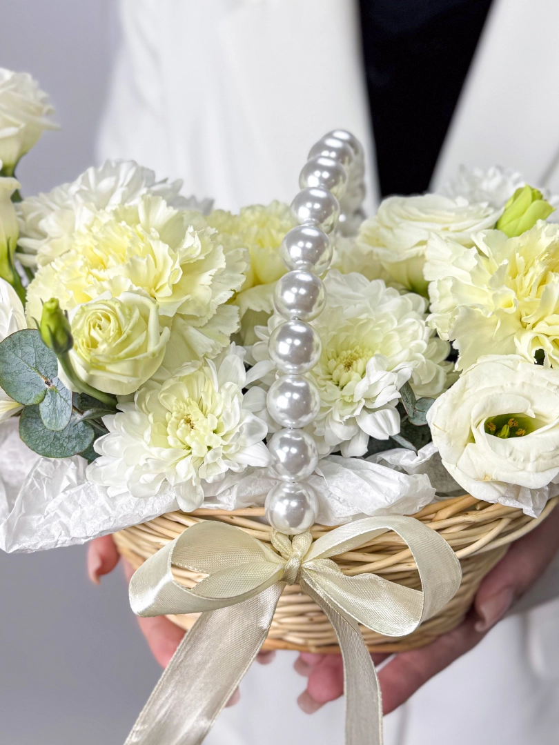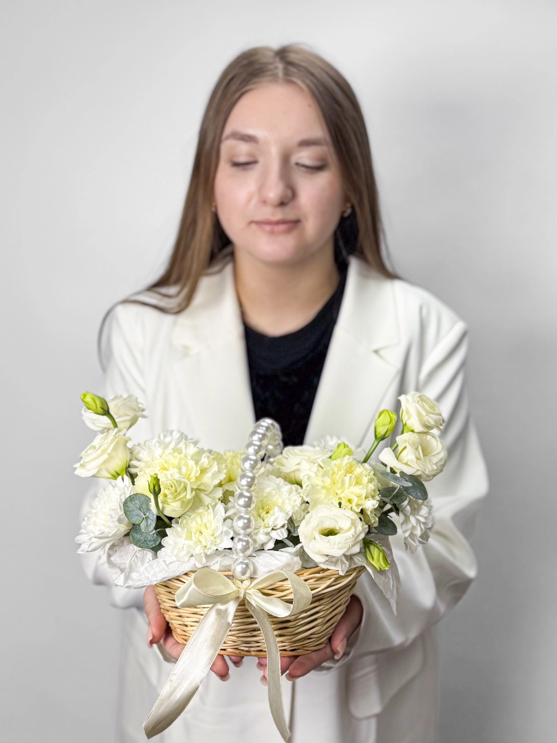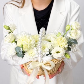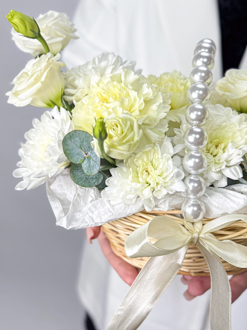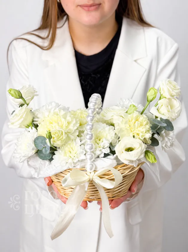Это изящный и нежный букет, собранный в уютную плетеную корзинку. В его композицию вошли элегантные гвоздики, хризантемы и эустомы, создающие гармоничный и утонченный образ. Букет дополняют серо-зеленые листья эвкалипта, придающие ему свежесть и легкость. Букет украшен аккуратной атласной лентой в цвет корзинки, символизирующей чистоту, искренность и нежность. Он идеально подойдет для особых случаев и поздравлений.