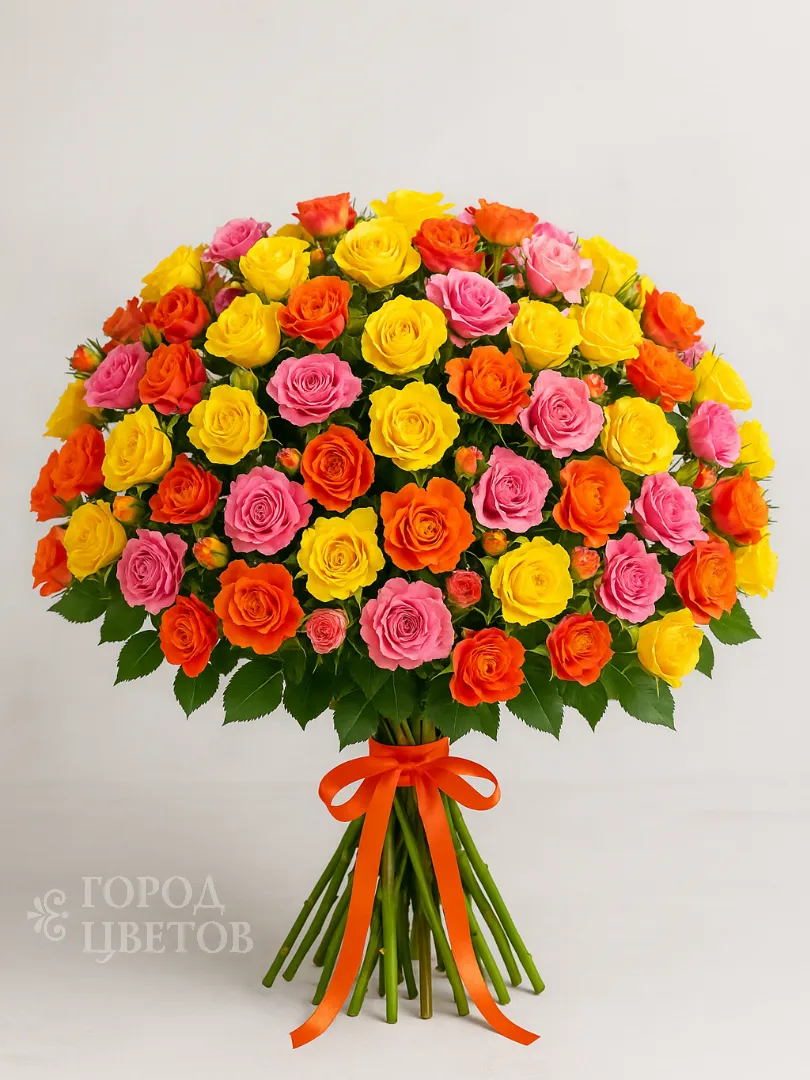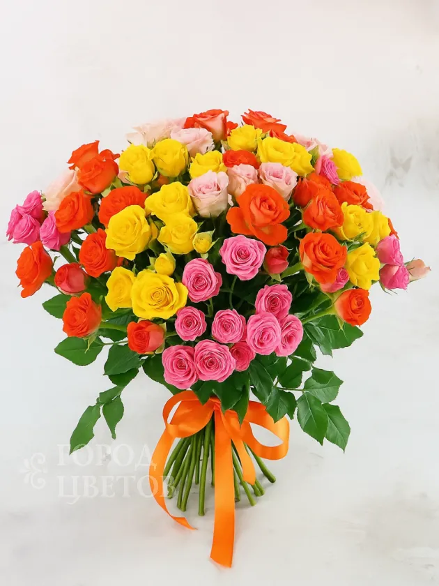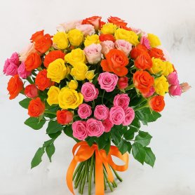 Яркий и солнечный букет из разноцветных роз — это настоящее воплощение радости и тепла! Нежно-розовые, солнечно-жёлтые и насыщенно-оранжевые розы создают гармоничную композицию, которая наполняет пространство светом и хорошим настроением. Каждая роза символизирует счастье, дружбу и любовь, а вместе они превращаются в настоящий фейерверк чувств.