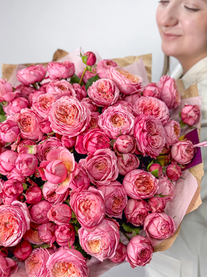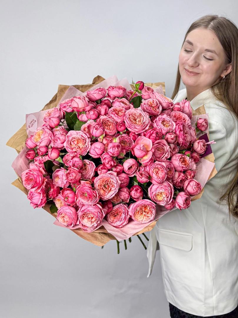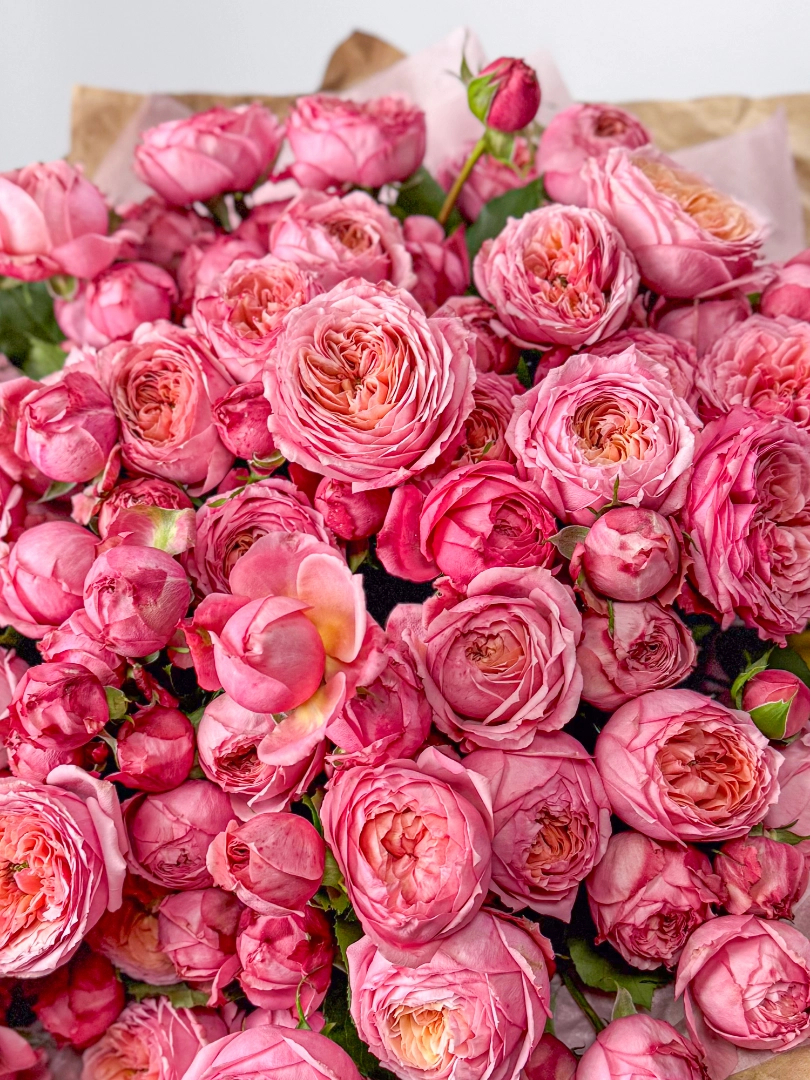 Этот букет из кустовых роз — настоящее воплощение нежности и изящества. Мягкие розовые оттенки цветов создают атмосферу романтики и тепла. Кустовые розы с их пышными и плотными соцветиями выглядят очень красиво и объемно, наполняя композицию ощущением роскоши и свежести. Такой букет станет прекрасным подарком для близкого человека, выражающим любовь, уважение и искренние чувства.