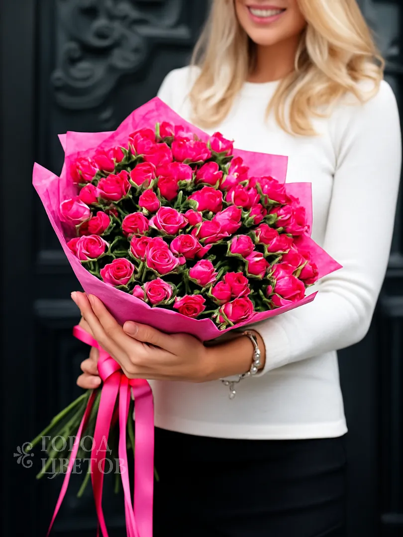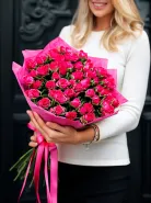 Яркий букет из малиновых кустовых роз — это стильный, эффектный и запоминающийся подарок, который сразу привлекает внимание. Пышные мини-розы насыщенного малинового оттенка собраны в плотную, гармоничную композицию и оформлены в розовую дизайнерскую упаковку с атласными лентами. Благодаря множеству бутонов на каждом стебле букет выглядит роскошно, объёмно и очень празднично.