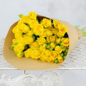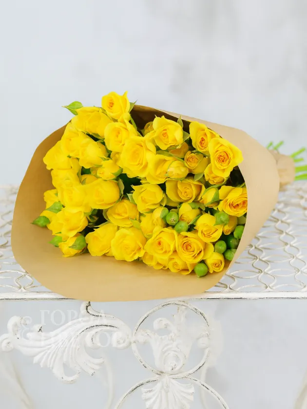 Букет ярких жёлтых кустовых роз – это настоящий концентрат солнца и хорошего настроения. Плотная «шапка» из десятков миниатюрных бутонов в крафтовой упаковке выглядит стильно и одновременно очень тёпло: такой букет дарят, чтобы сказать «спасибо», поздравить с днём рождения, 8 Марта, юбилеем или просто порадовать близкого человека без повода. Жёлтые кустовые розы долго сохраняют свежесть и раскрываются постепенно, каждый день напоминая о заботе дарителя.