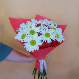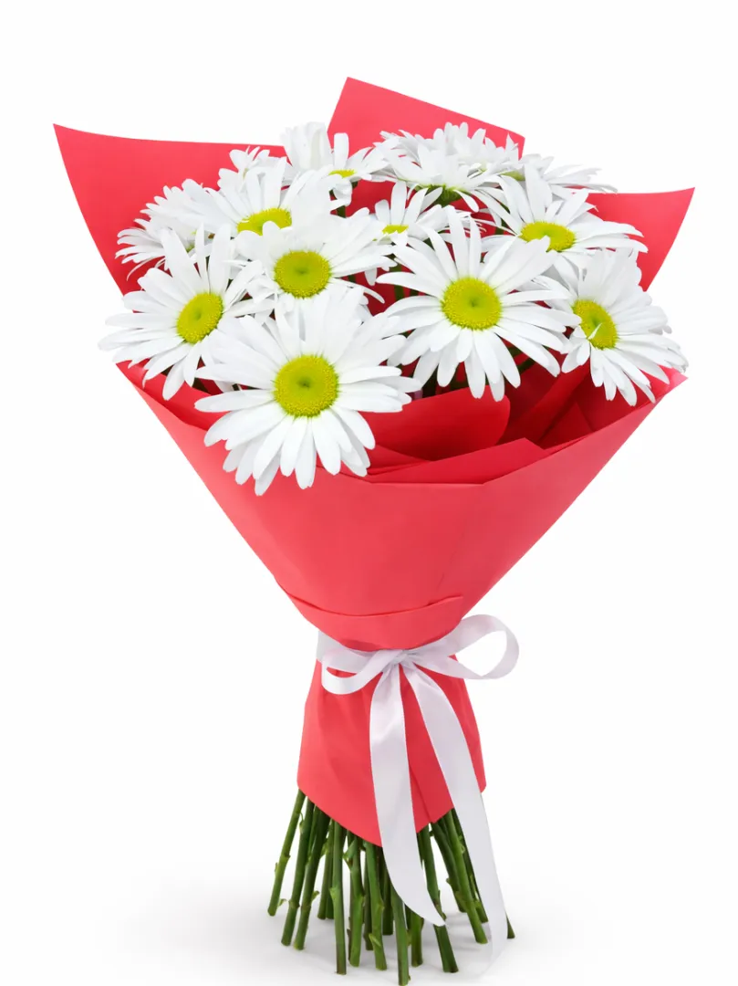 Этот яркий и свежий букет состоит из красивых белых ромашек с яркими желто-зелеными центрами. Цветы аккуратно собраны в розовую упаковку, дополненную белой лентой, которая придает композиции изящность и праздничность. Такой букет отлично подойдет для подарка на любой повод, чтобы порадовать близкого человека светлым настроением и искренними добрыми чувствами.