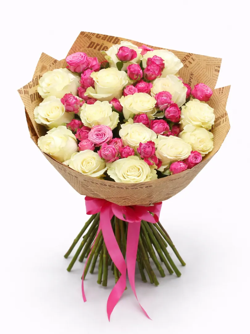 Этот изящный букет состоит из нежных белых и ярких розовых роз, собранных в гармоничную композицию. Белые розы символизируют чистоту и искренность, а розовые добавляют нежности и романтики. Букет аккуратно оформлен в упаковке из бумаги с имитацией газетной печати, украшен розовой лентой, которая добавляет ему особого очарования. Такой букет станет прекрасным подарком для выражения любви, благодарности или просто чтобы порадовать близкого человека.