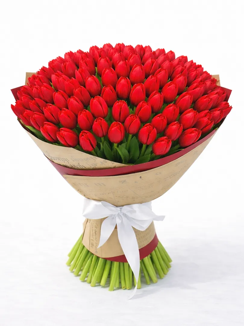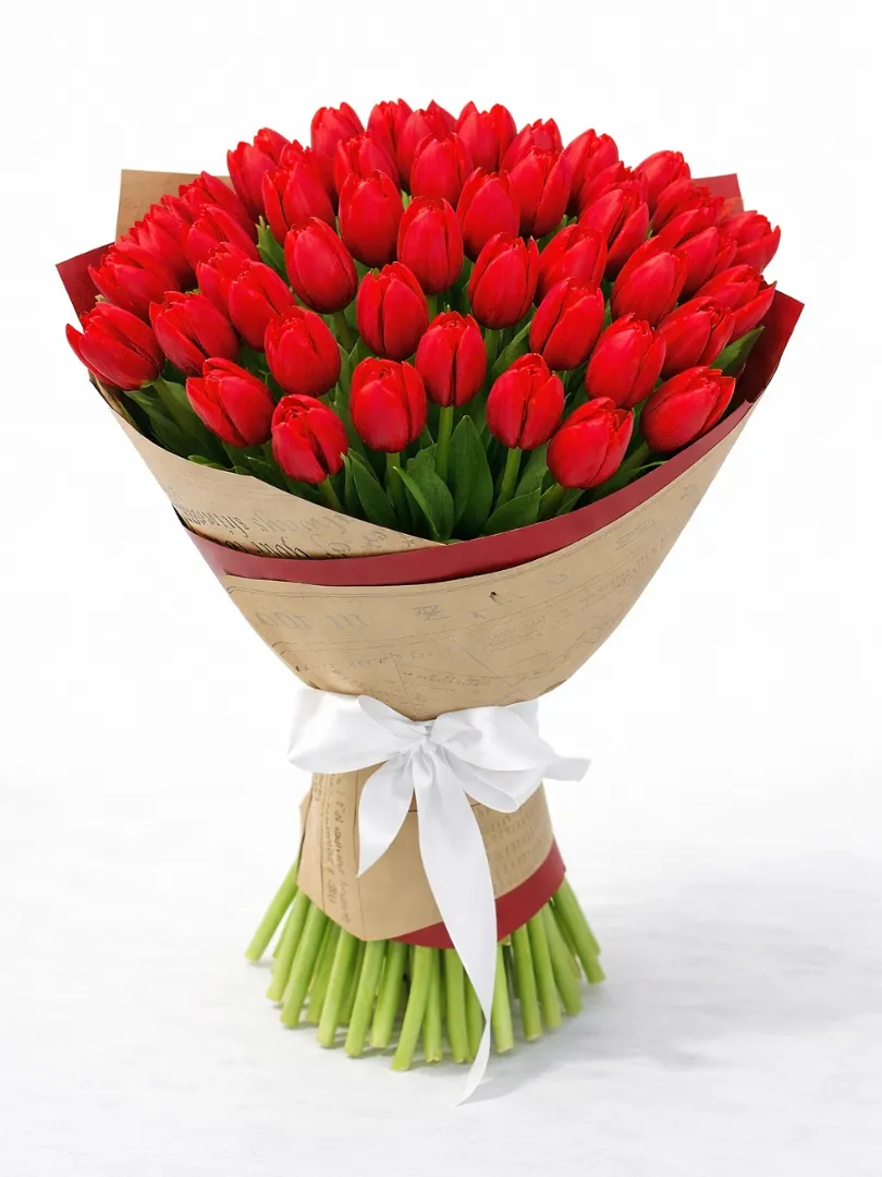 Этот элегантный букет состоит из ярких, насыщенных красных тюльпанов, аккуратно собранных в изысканную композицию. Цветы выглядят свежими и пышными, символизируя страсть, любовь и уважение. Букет украшен белой лентой и обернут в стильную бумагу, что придает ему особую изящность и праздничность. Идеальный подарок для выражения самых искренних чувств и радости.