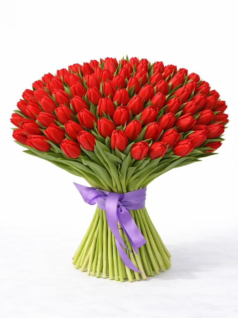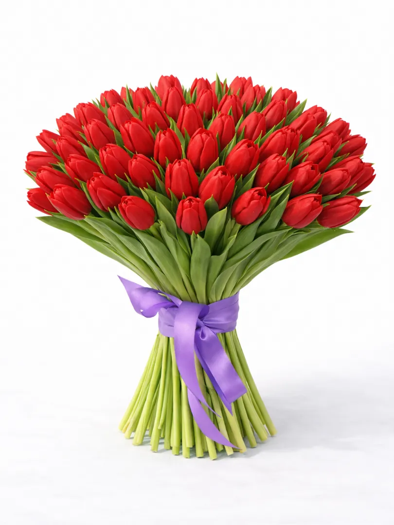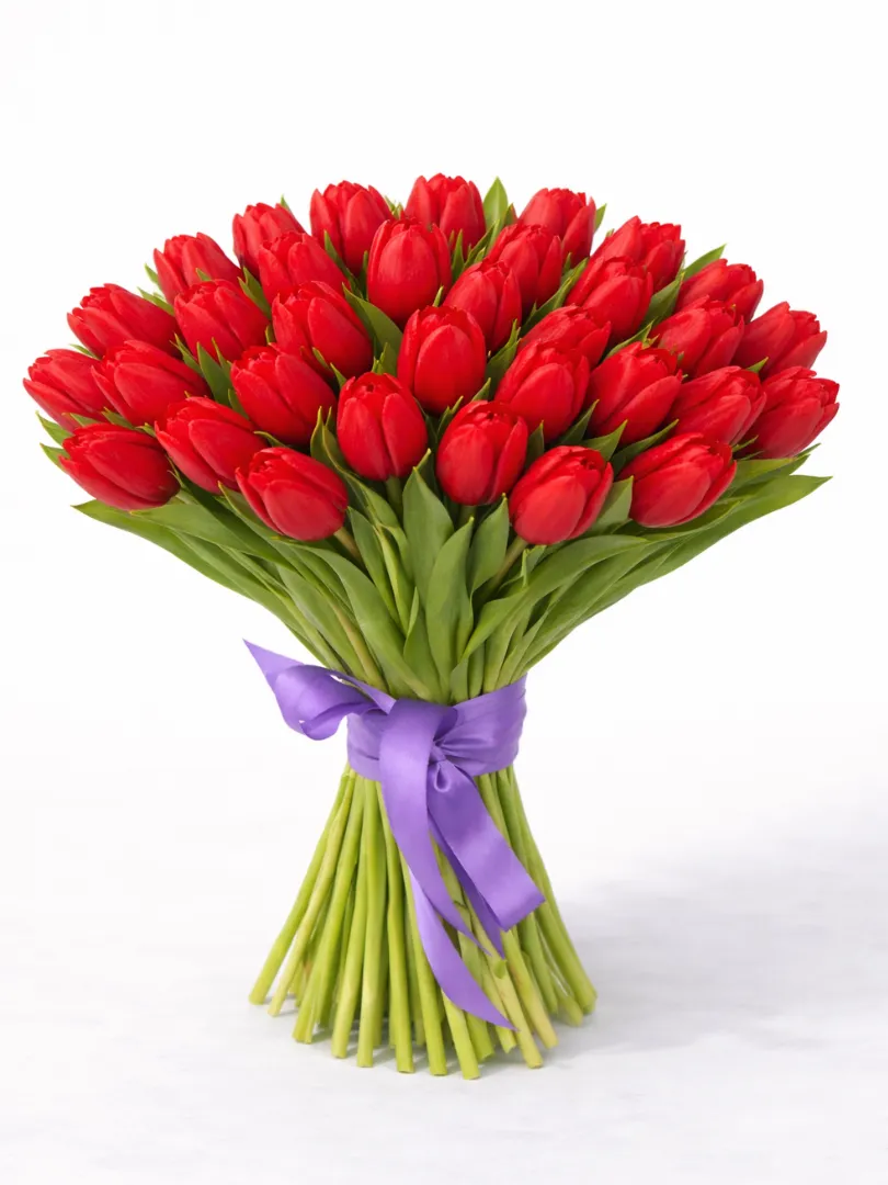 Этот изящный букет состоит из ярких красных тюльпанов, аккуратно собранных в элегантную композицию. Каждая цветочная головка излучает тепло и страсть, создавая атмосферу радости и любви. Свежие зеленые листья гармонично подчеркивают насыщенный оттенок лепестков, придавая букету свежести и природной красоты. Букет украшен яркой красной лентой, которая добавляет ему особого шарма и завершенности. Такой букет станет прекрасным подарком для выражения чувств, поздравлений или просто чтобы порадовать близких.