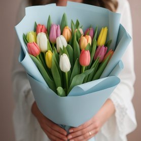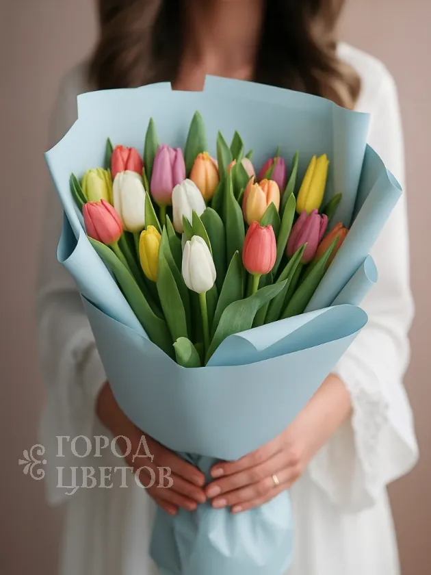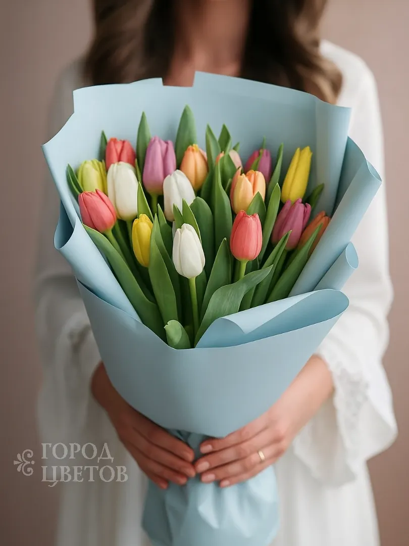Цветы оформлены в современную матовую упаковку спокойного голубого цвета, которая подчёркивает натуральную красоту тюльпанов и придаёт композиции деликатность и изящество. Букет выглядит дорого, аккуратно и гармонично — отличный подарок для женщины любого возраста.