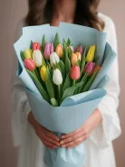 Нежный и стильный букет из разноцветных тюльпанов — это идеальный выбор для тех, кто хочет подарить яркие эмоции и весеннее настроение. В композиции собраны свежие тюльпаны разных оттенков: белые, жёлтые, розовые, оранжевые, малиновые и лиловые. Такое сочетание делает букет живым, динамичным и по-настоящему праздничным.