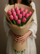 Наш букет из розовых тюльпанов — это воплощение женственности, романтики и заботы. Каждое соцветие отобрано вручную, чтобы подчеркнуть изящество формы и насыщенность оттенков. Цветы оформлены в стильную крафтовую упаковку, которая добавляет композиции натуральности и утончённости.