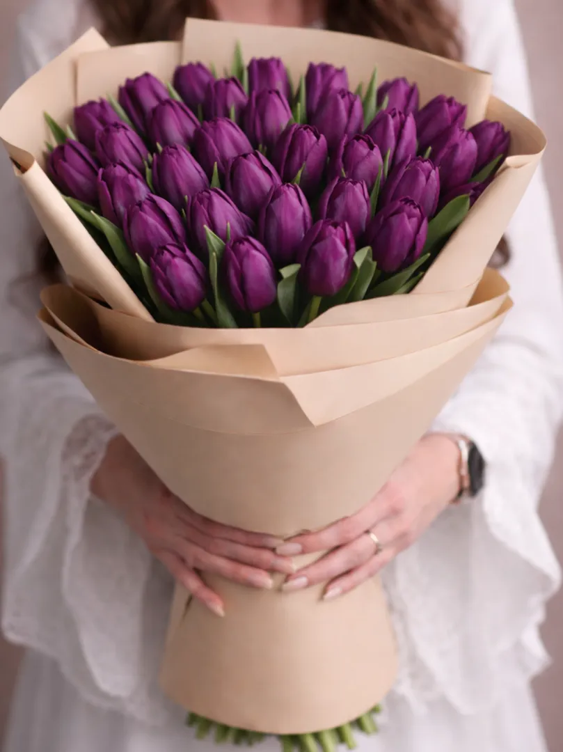 Очаровательный букет из 21/31/51/101 фиолетового тюльпана — это символ нежности, восхищения и утончённого вкуса. Каждая свежая тюльпановая головка подобрана вручную и аккуратно оформлена в стильную крафтовую упаковку, подчеркивающую естественную красоту цветов.
