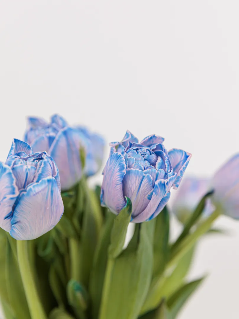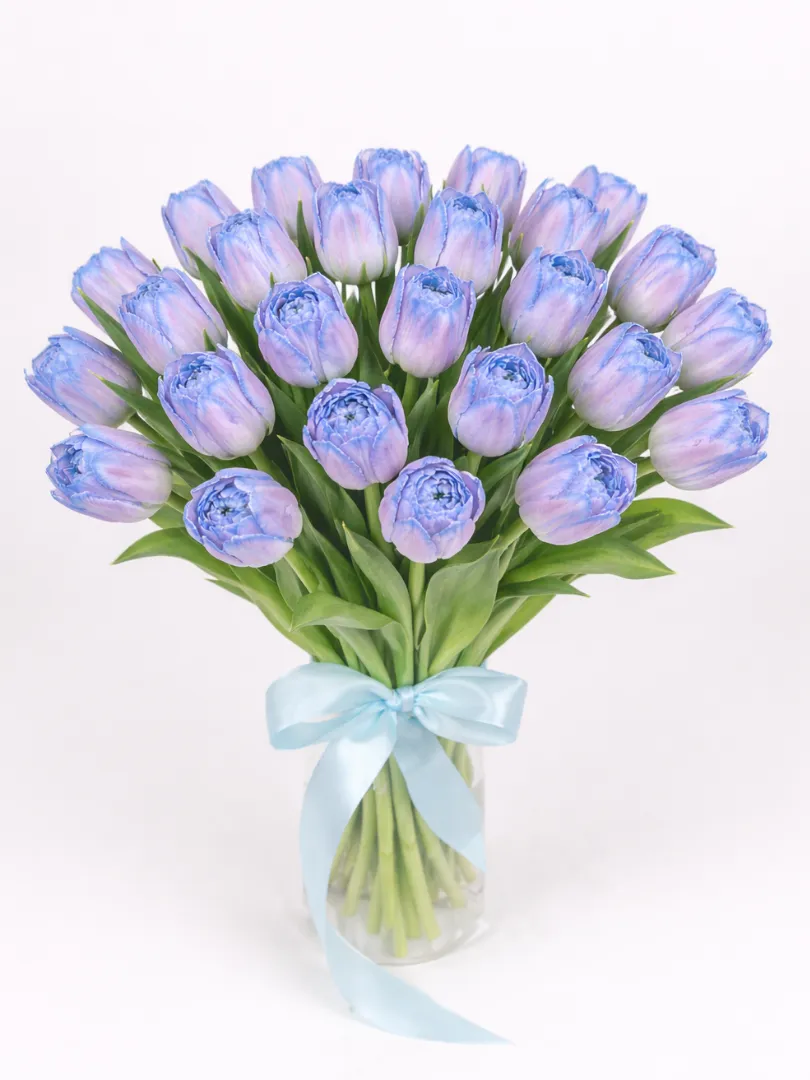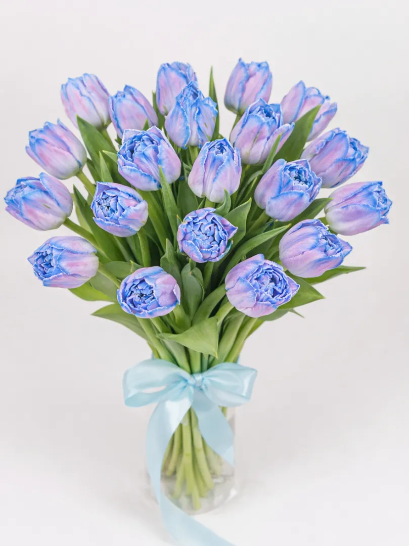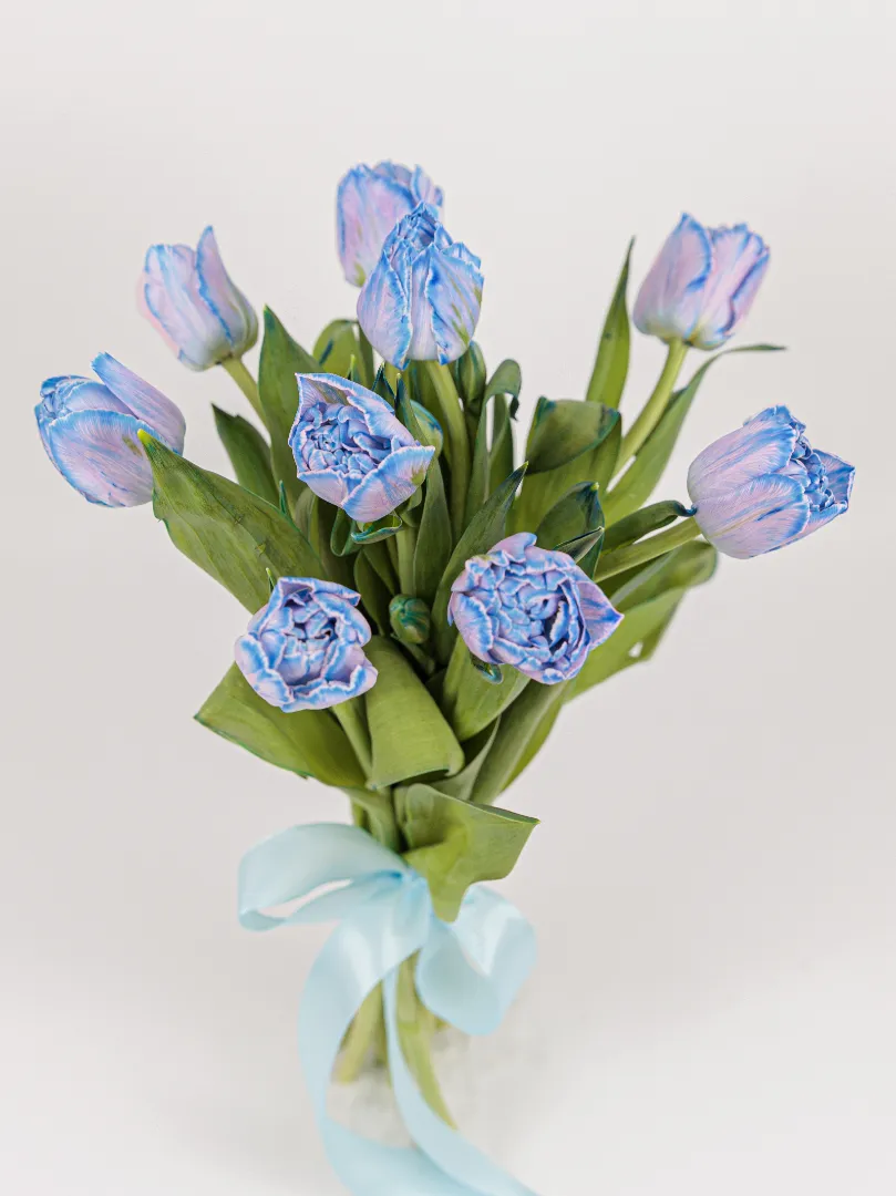 Элегантный букет из махровых тюльпанов сорта Dreamer в нежном лавандово-голубом оттенке. Крупные пионовидные бутоны выглядят объёмно и премиально, создавая эффектный и современный образ.