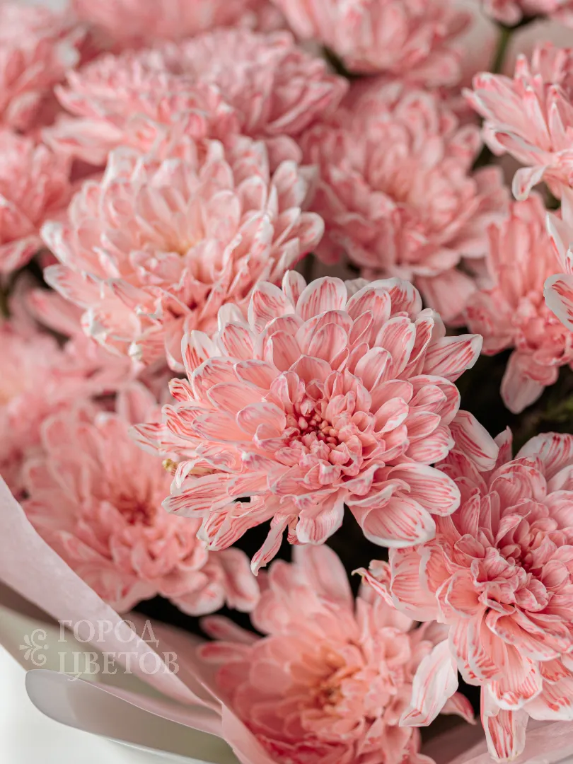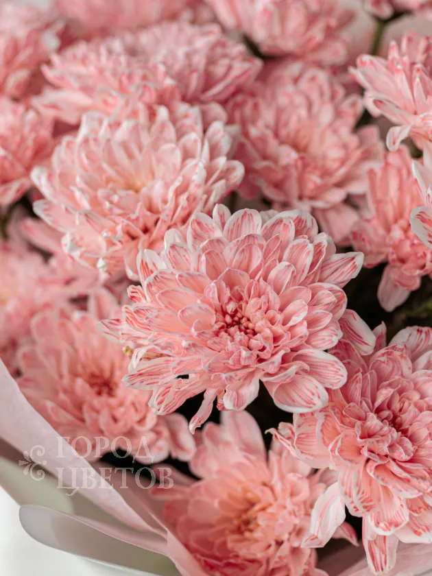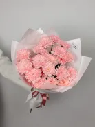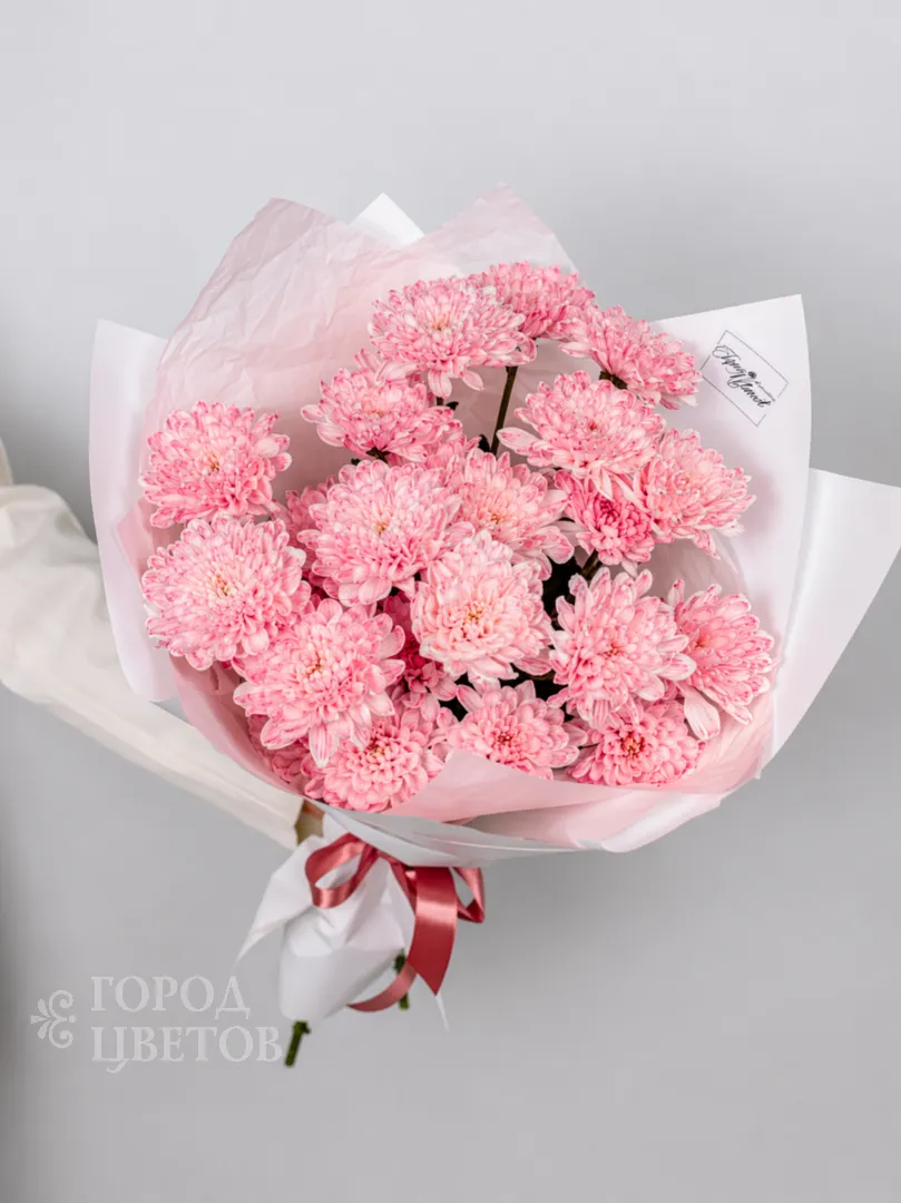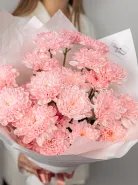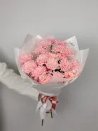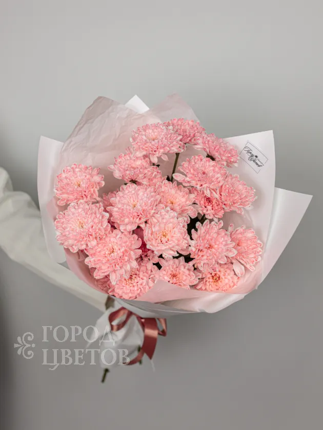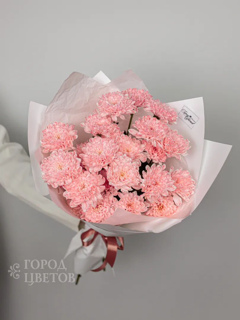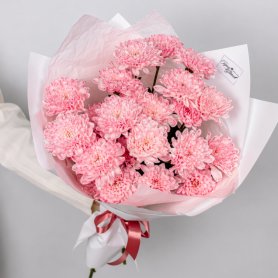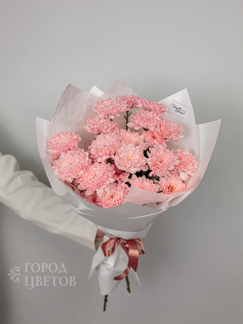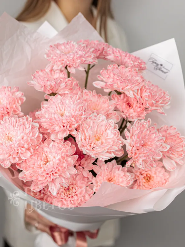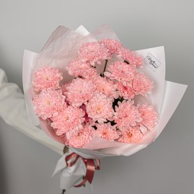 очаровательный букет из воздушных розовых хризантем, собранных в мягкой пастельной гамме. Нежные, пушистые соцветия создают эффект лёгкого облака, а стильная белая упаковка подчёркивает утончённость оттенков. Букет перевязан аккуратной лентой, что делает композицию особенно элегантной и аккуратной.