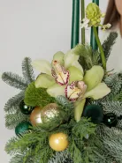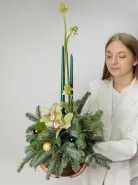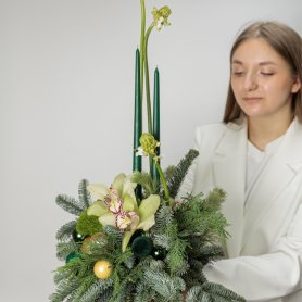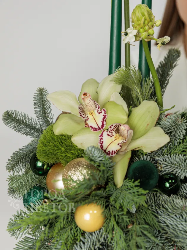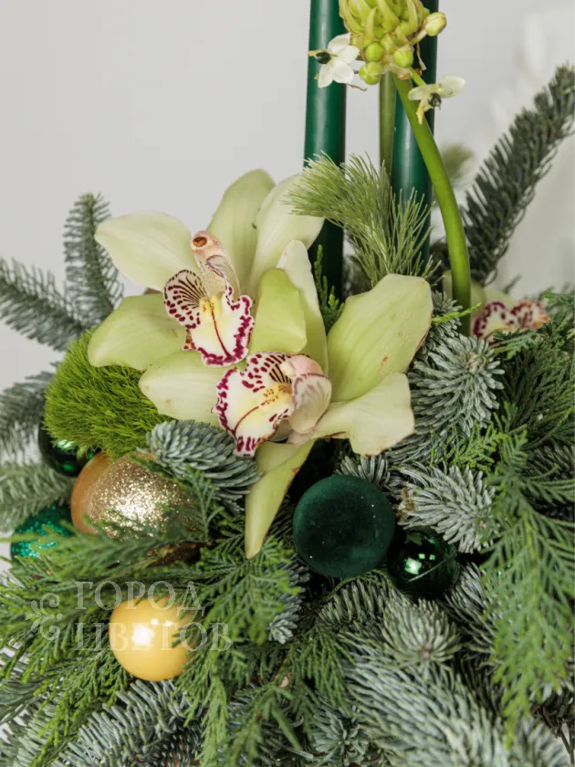 Элегантная и современная композиция, созданная с использованием свежих цветов и зелени, идеально подойдет для праздничных мероприятий и украшения интерьера. В центре внимания — изящные орхидеи и утонченные ветви хвойных деревьев, дополненные яркими декоративными шарами и свечами. Эта оригинальная композиция передает атмосферу уюта, роскоши и праздничного настроения, подчеркнет индивидуальность вашего праздника и создаст незабываемую волшебную атмосферу