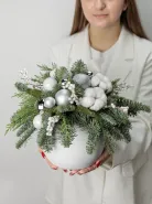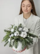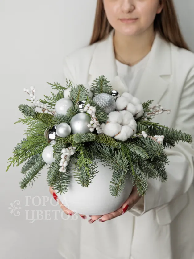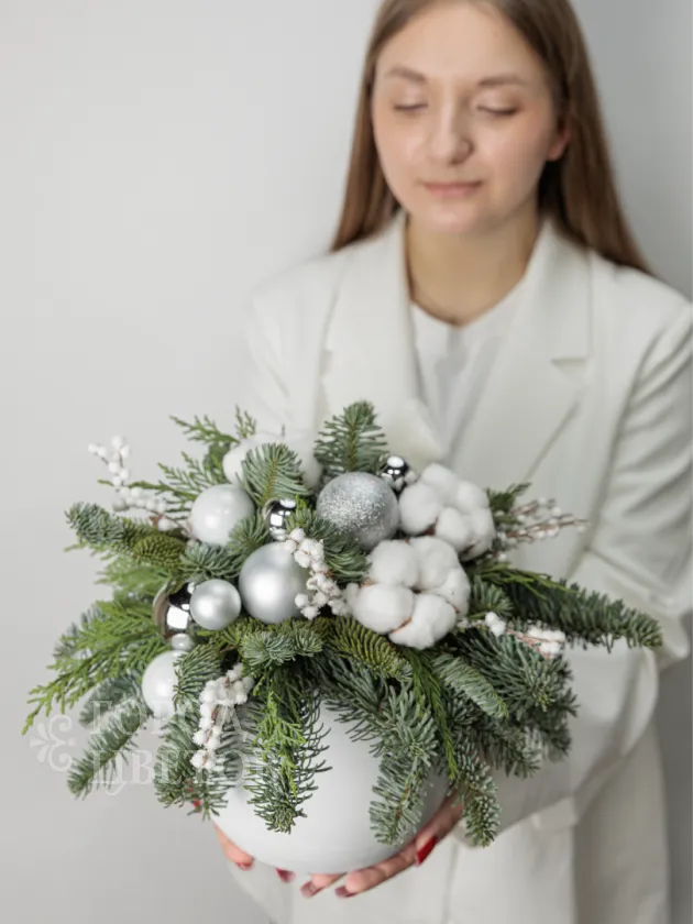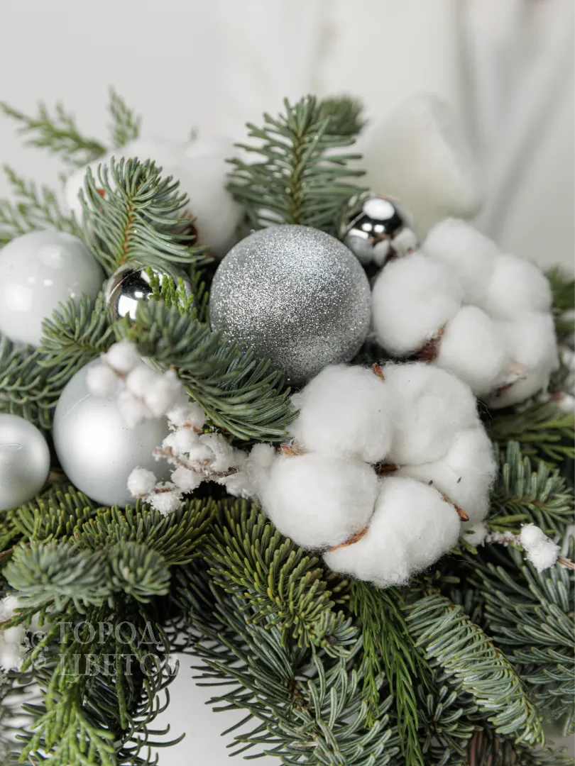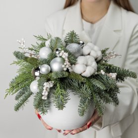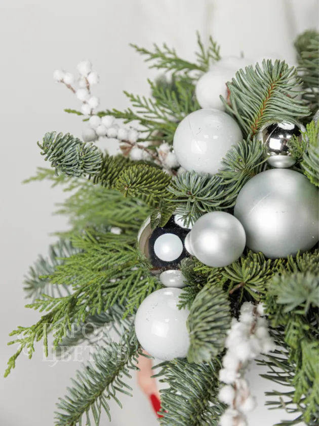 Это элегантная новогодняя композиция, выполненная из свежих хвойных веточек, аккуратно расположенных в белой керамической вазе. Украшение включает серебристые и белые новогодние шары разного размера, а также пушистые хлопковые веточки, создающие эффект заснеженной зимней сказки. Дополнительные декоративные элементы — серебристая блестящая игрушка и веточки с белыми ягодами — подчеркивают праздничную тематику и добавляют композиции изящества и зимнего очарования. Общий стиль — свежий и праздничный, идеально подходит для украшения интерьера в зимний сезон или как стильный подарок.