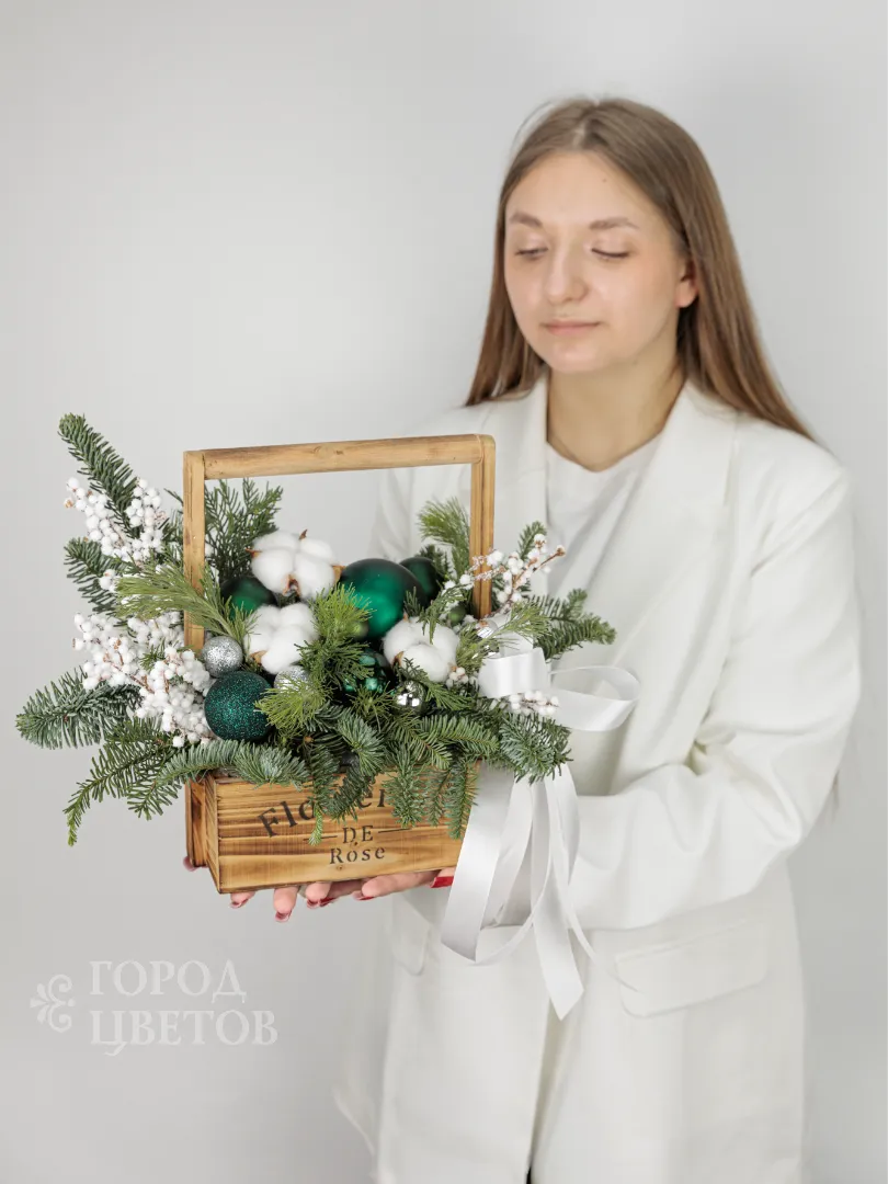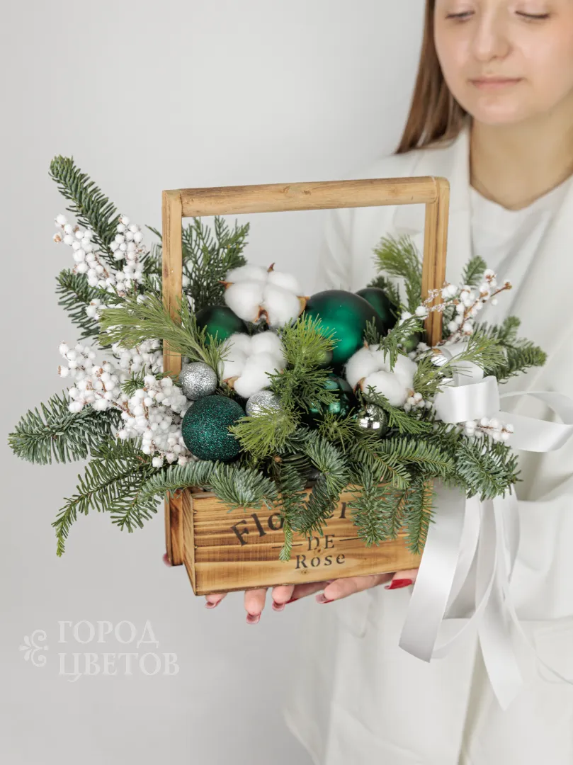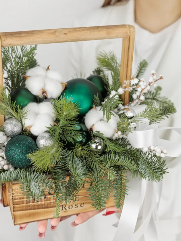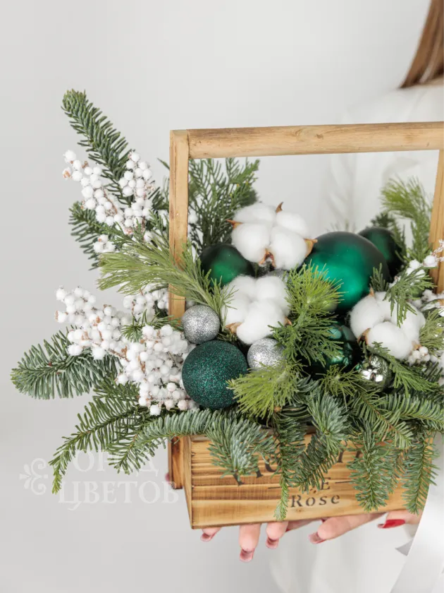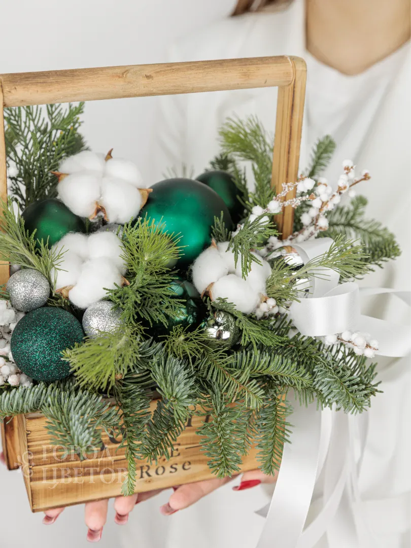 Это праздничная новогодняя композиция, выполненная в стиле зимней сказки. В центре — натуральные зелёные веточки ели и туи, украшенные серебристыми и зелёными шариками различных размеров, а также пушистыми хлопковыми веточками, имитирующими снег. Дополнительные элементы — белые ягодки и декоративные веточки, создающие ощущение свежести и зимней красоты. Композиция оформлена в деревянной корзине с белой лентой, придающей ей праздничный и элегантный вид. Общий стиль — уютный, свежий и праздничный, идеально подходящий для украшения интерьера в новогодние праздники.