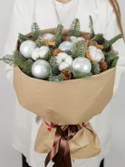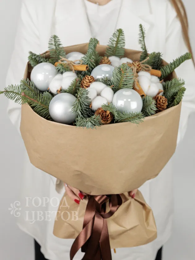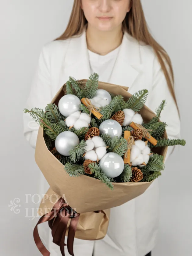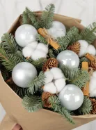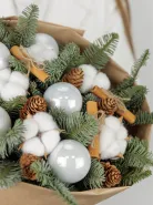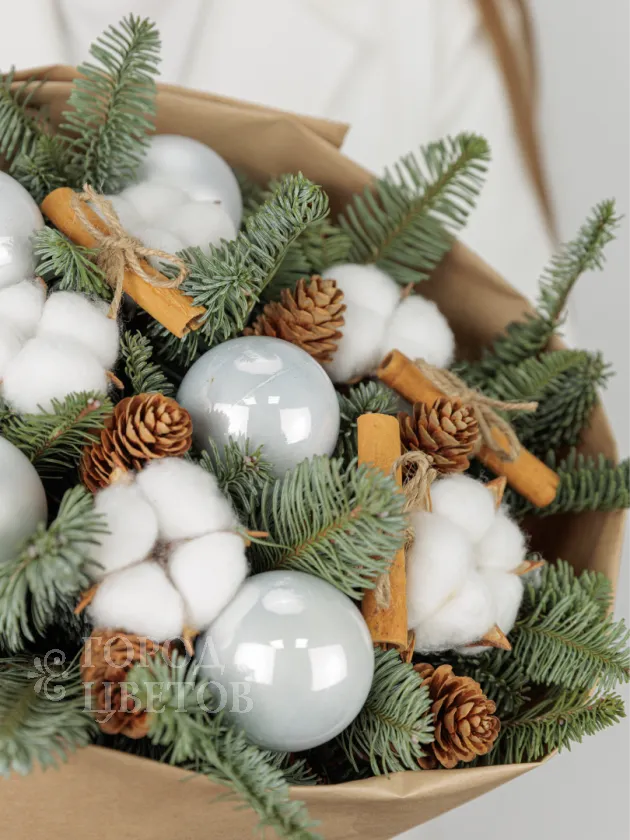 Этот элегантный зимний букет состоит из свежих хвойных веток, украшенных белыми декоративными шарами и мягким хлопковым материалом, которые создают атмосферу уюта и праздничного настроения. В композиции также присутствуют шишки и палочки корицы, которые добавляют нотку природной теплоты и ароматной свежести. Идеальный подарок на праздники, который подчеркнёт ваше внимание и создаст праздничную атмосферу в любом интерьере.