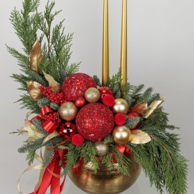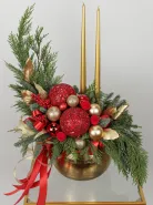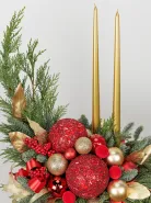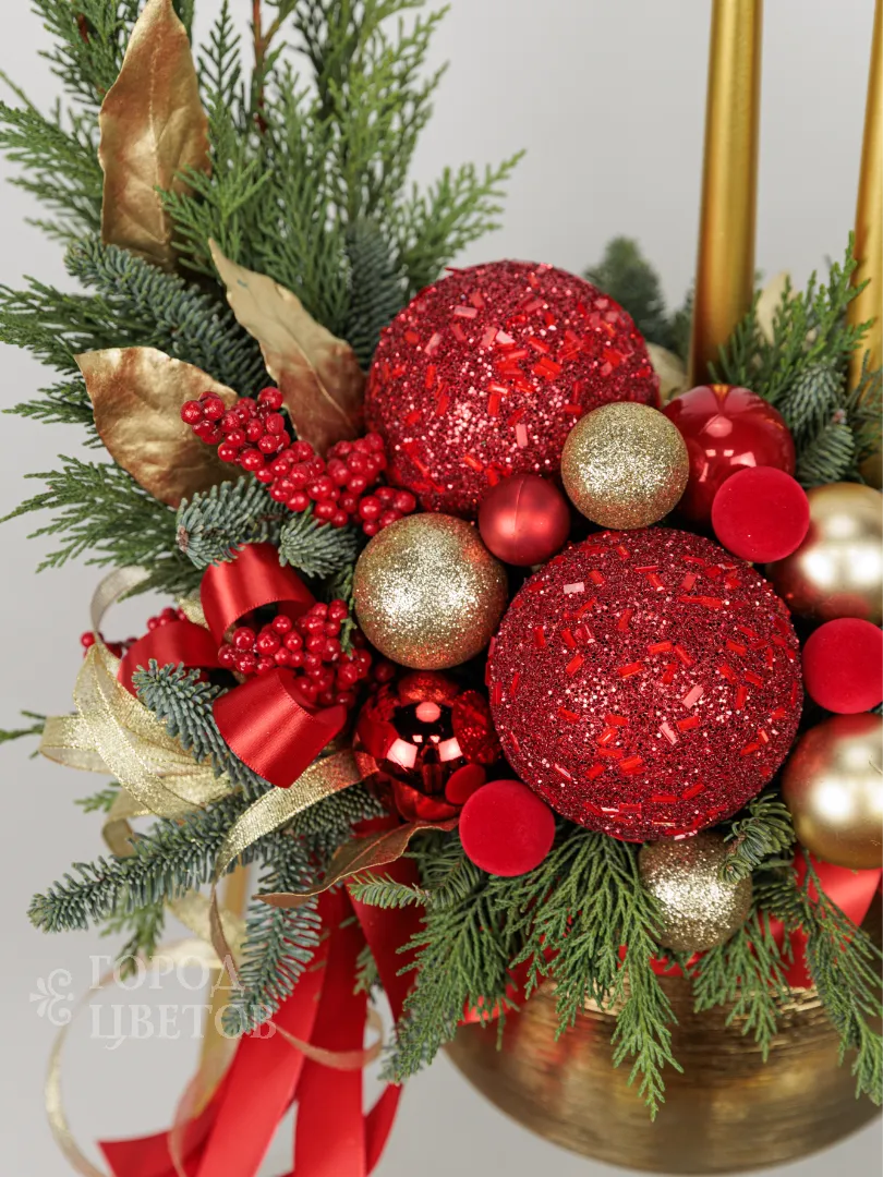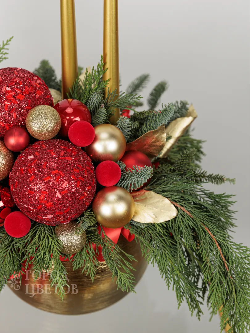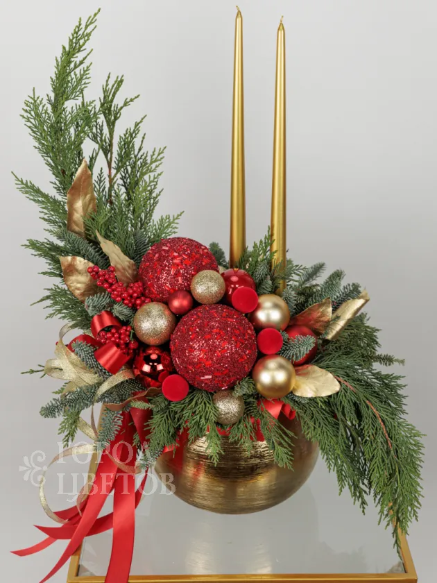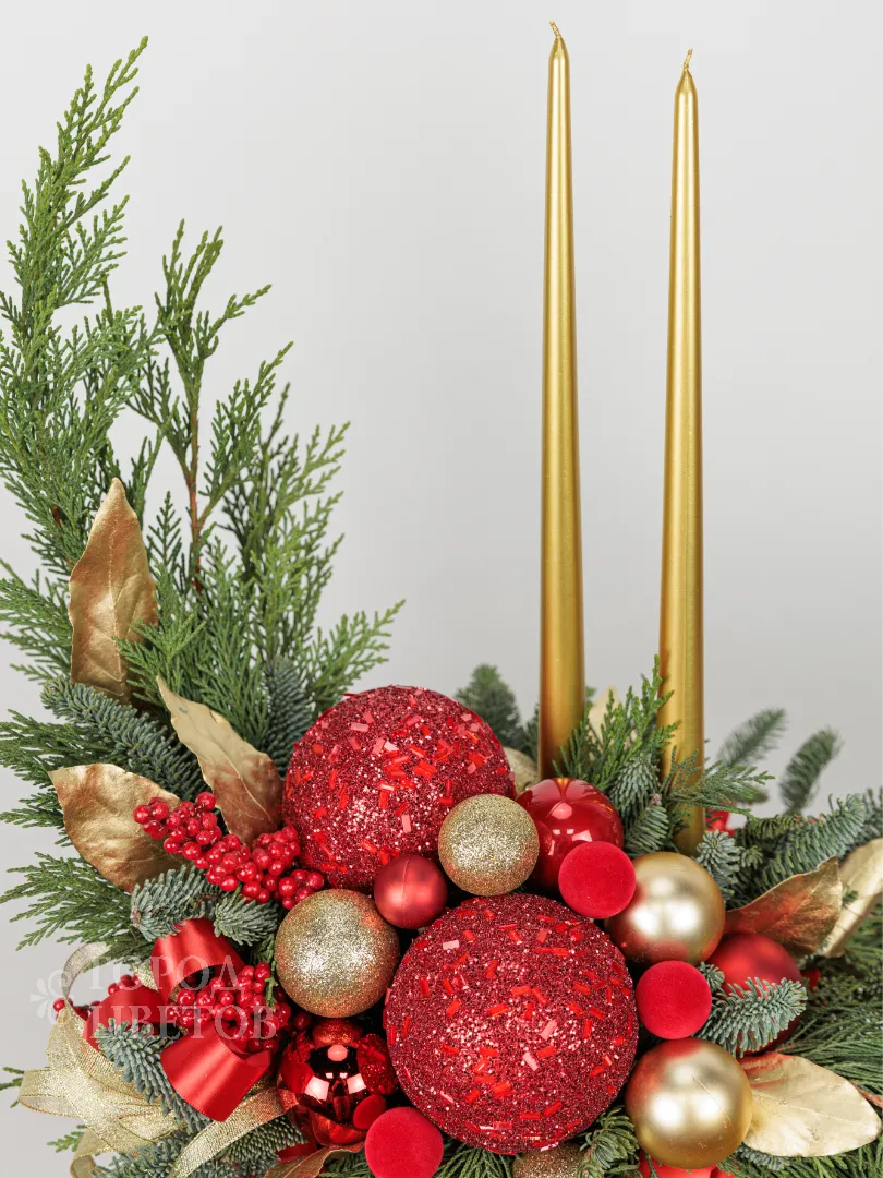 Эта праздничная композиция выполнена в классическом новогоднем стиле с яркими акцентами красного и золота. В центре расположена элегантная золотая ваза, наполненная свежими зелёными ветками хвойных деревьев. Украшение включает крупные красные и золотые шары, а также мелкие декоративные элементы, создающие ощущение богатства и торжественности. В дополнение к ним добавлены золотые листья и красные ягодки, а два тонких золотых свечи придают композиции особую изысканность и уют. Общий вид композиции — элегантный, яркий и праздничный, идеально подходящий для украшения интерьера в новогодние праздники.