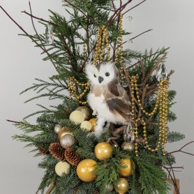 Элегантная новогодняя композиция из свежих хвойных веток украшена золотистыми и серебристыми шарами, шишками и декоративными элементами. В центре композиции расположена искусственная сова, которая добавляет уюта и природной привлекательности. Золотистые бусины и искусственные кристаллы создают праздничную атмосферу, а мягкое сочетание зелени и ярких украшений подчеркнет теплоту и волшебство новогодних праздников. Идеальное решение для украшения интерьера в зимний сезон.