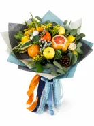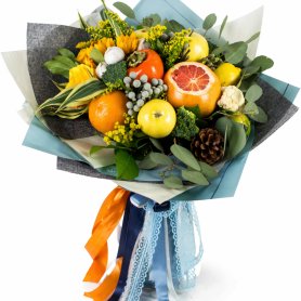 Этот уникальный букет — настоящее сочетание природной красоты и ярких красок. В центре композиции — свежие и сочные фрукты: апельсины, яблоки, грейпфруты, создающие свежий и аппетитный акцент. Вокруг них разбросаны зеленые листья и веточки, придающие букету естественность и живость. Композицию дополняют декоративные элементы: шишки, ягоды и нежные цветы, создающие гармонию и уют. Такой букет идеально подойдет в качестве оригинального подарка или украшения для праздничного стола, наполняя его свежестью и яркими красками